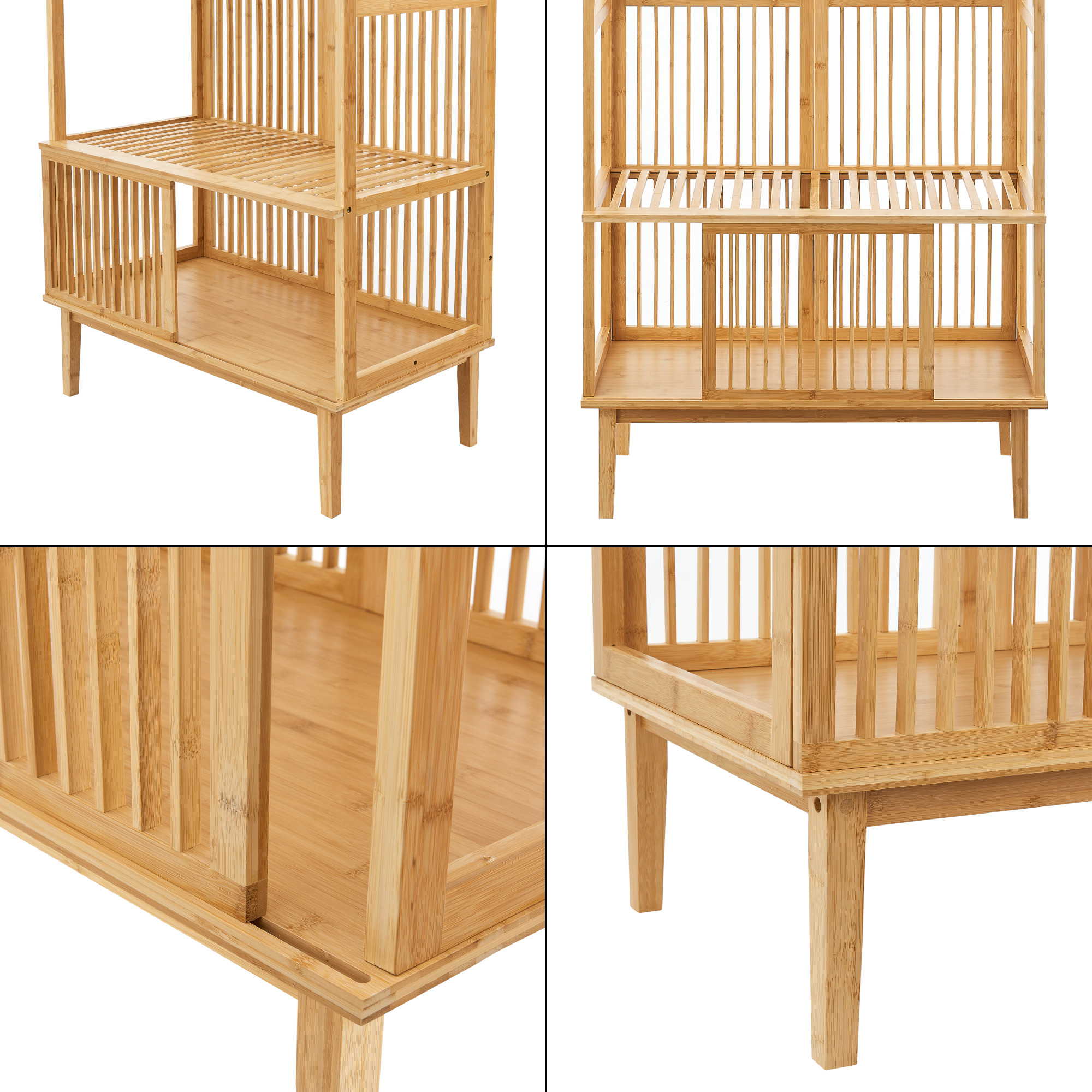 Prevăzut cu bară pentru umerașe, raft superior pentru pălării sau cutii și compartiment inferior generos pentru pantofi, genți ori textile, acest suport haine te ajută să păstrezi totul la îndemână. Construcția stabilă din bambus susține hainele în siguranță și contribuie la un ambient cald și primitor.