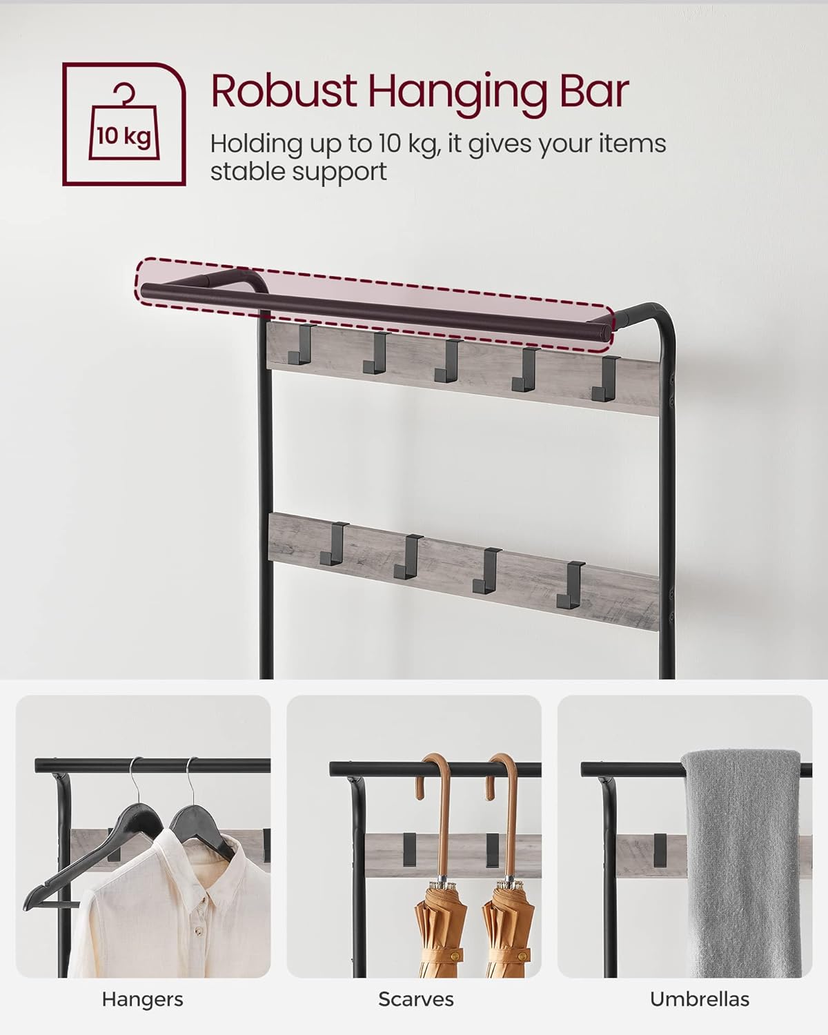 Așază acest cuier cu pantofar și bancă în hol sau la intrare pentru a avea mereu hainele și încălțămintea bine organizate. Cârligele sunt potrivite pentru geci, paltoane, poșete sau accesorii, iar bara superioară poate fi folosită pentru umerașe sau haine mai lungi.