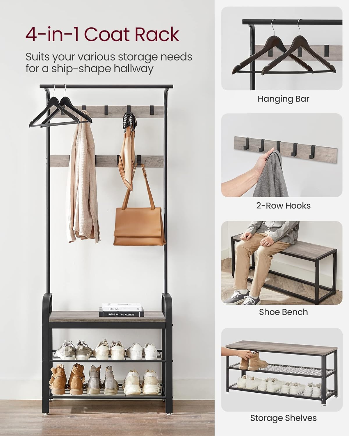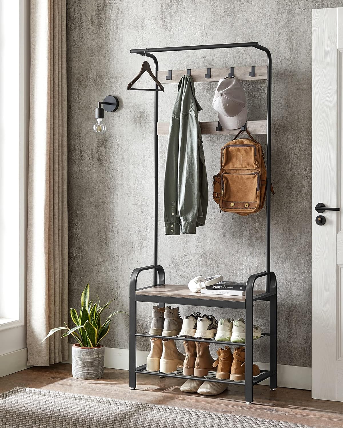 Cuier pentru hol VASAGLE cu bancă, 9 cârlige și raft pantofi, gri-negru