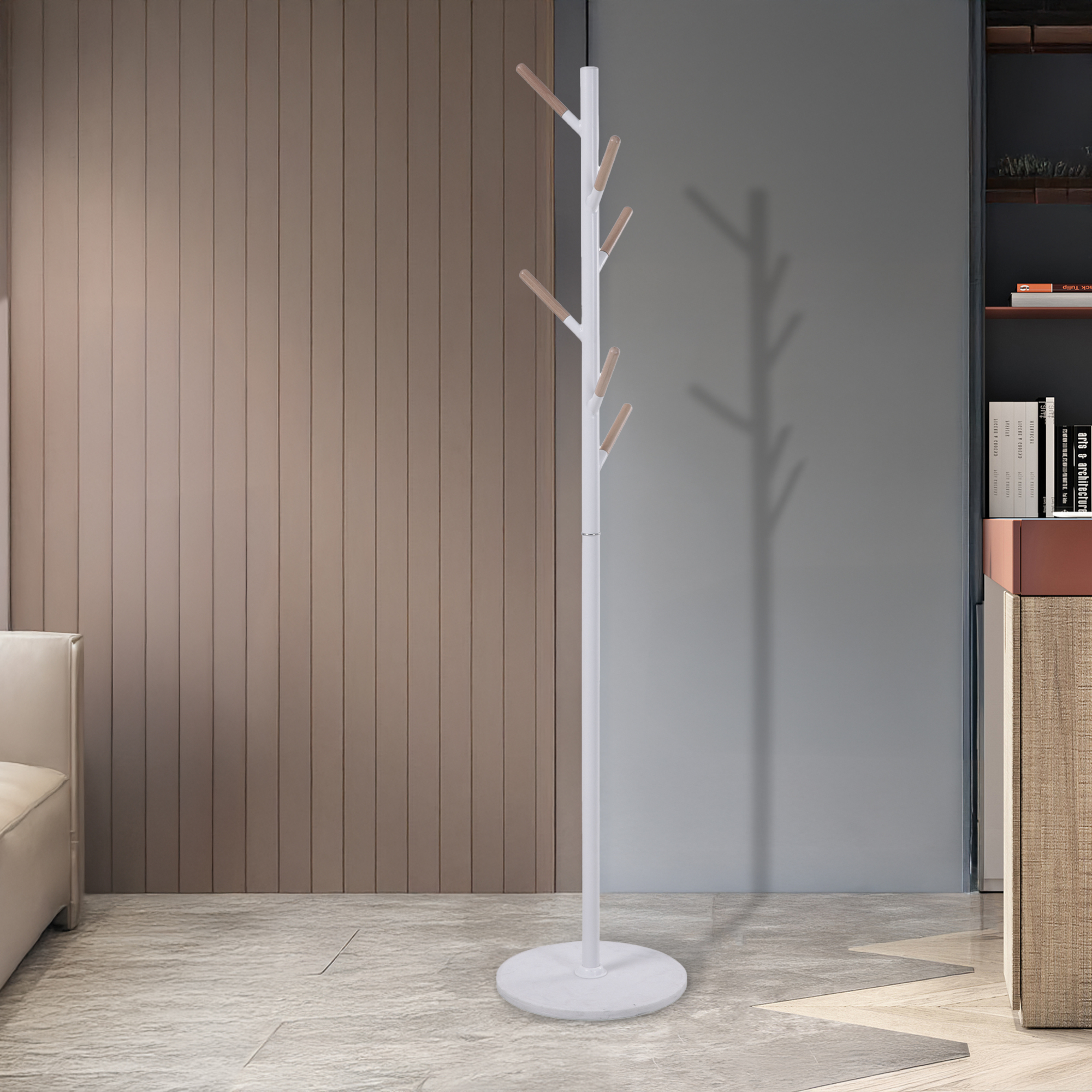 Prevăzut cu 6 cârlige, acest cuier metalic îți permite să organizezi eficient jachete, paltoane, eșarfe, genți sau rucsacuri. Forma sa tip copac economisește spațiu și adaugă un accent decorativ discret, în timp ce baza solidă asigură stabilitate foarte bună în utilizarea de zi cu zi.