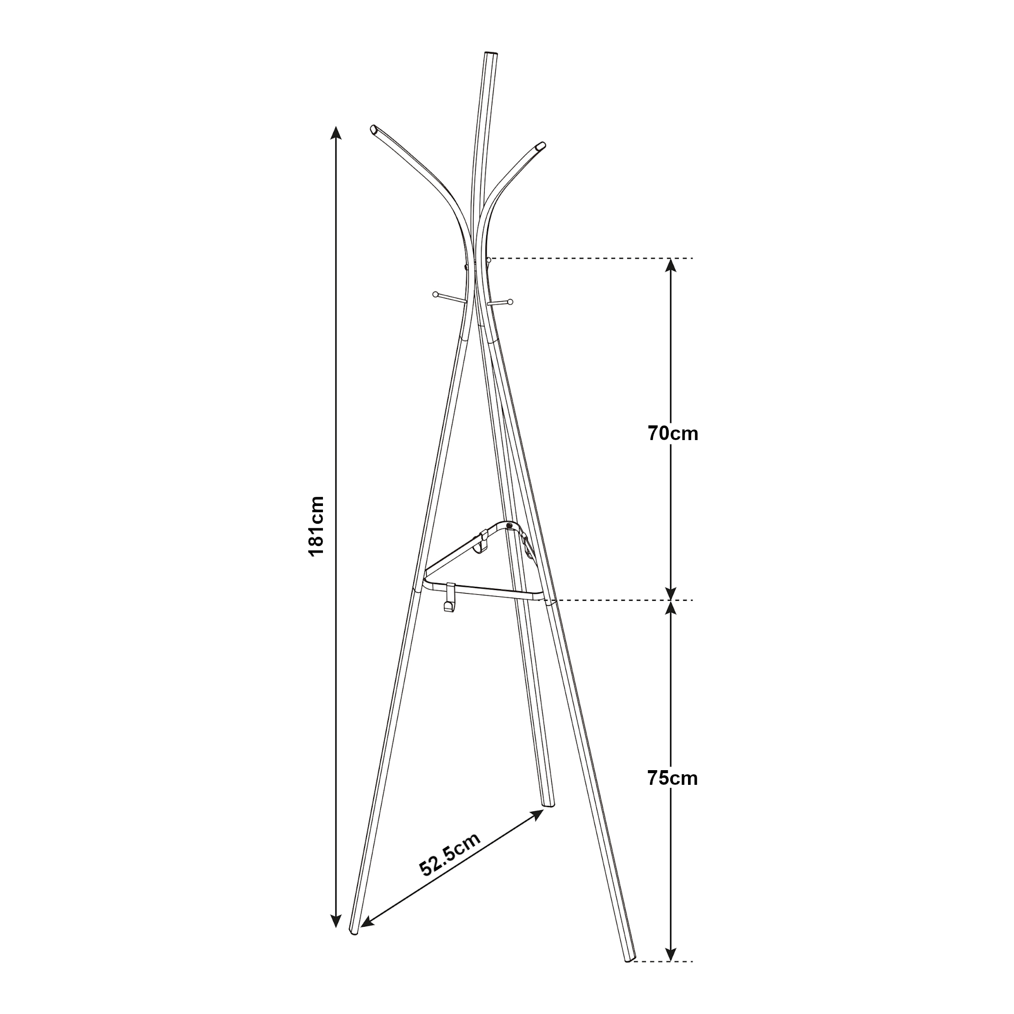 Datorită structurii sale înalte și bine organizate, acest suport pentru haine ajută la păstrarea ordinii și la folosirea eficientă a spațiului. Cele trei cârlige curbate din partea superioară permit agățarea clară a articolelor vestimentare, iar cârligele suplimentare sunt practice pentru pălării, genți sau alte accesorii.
