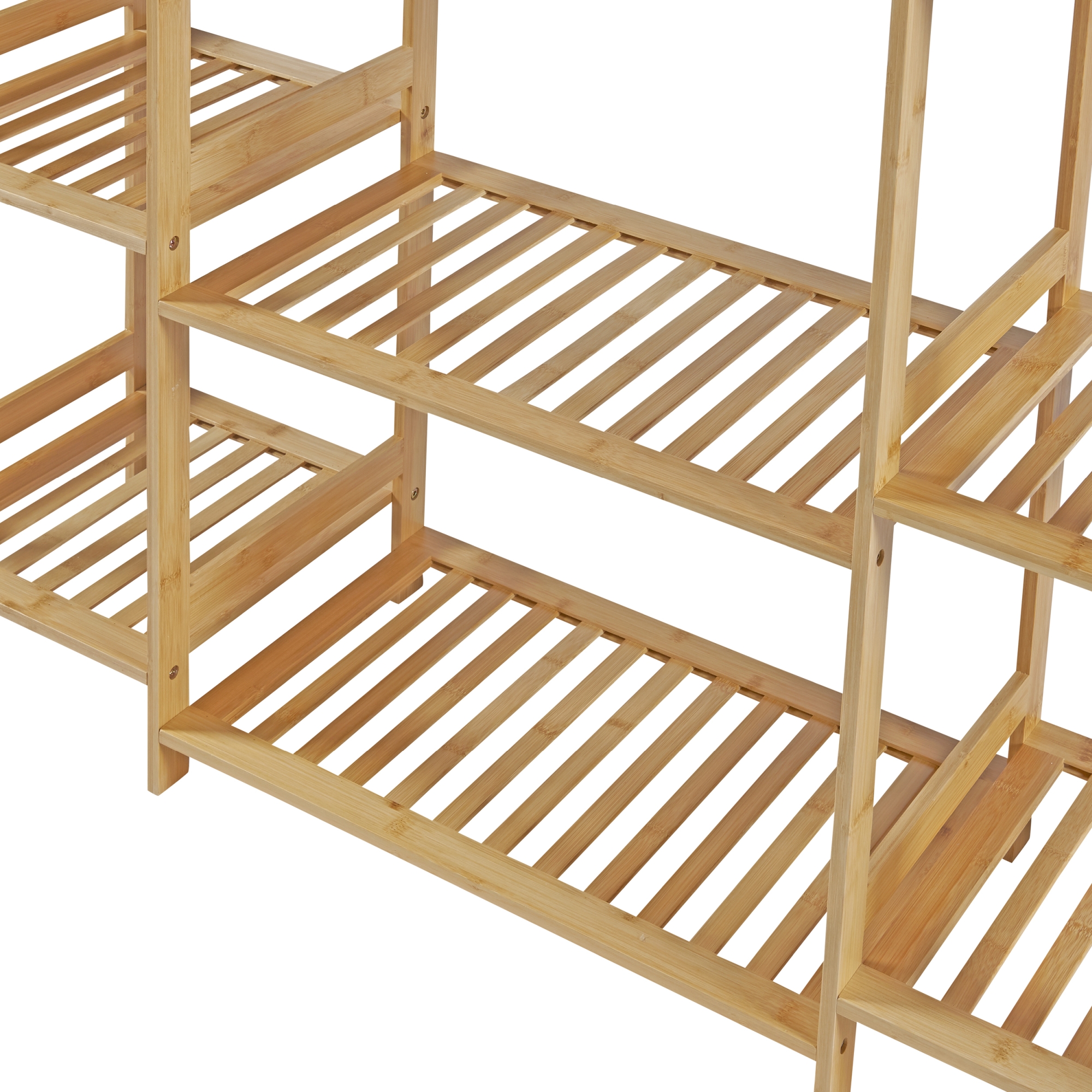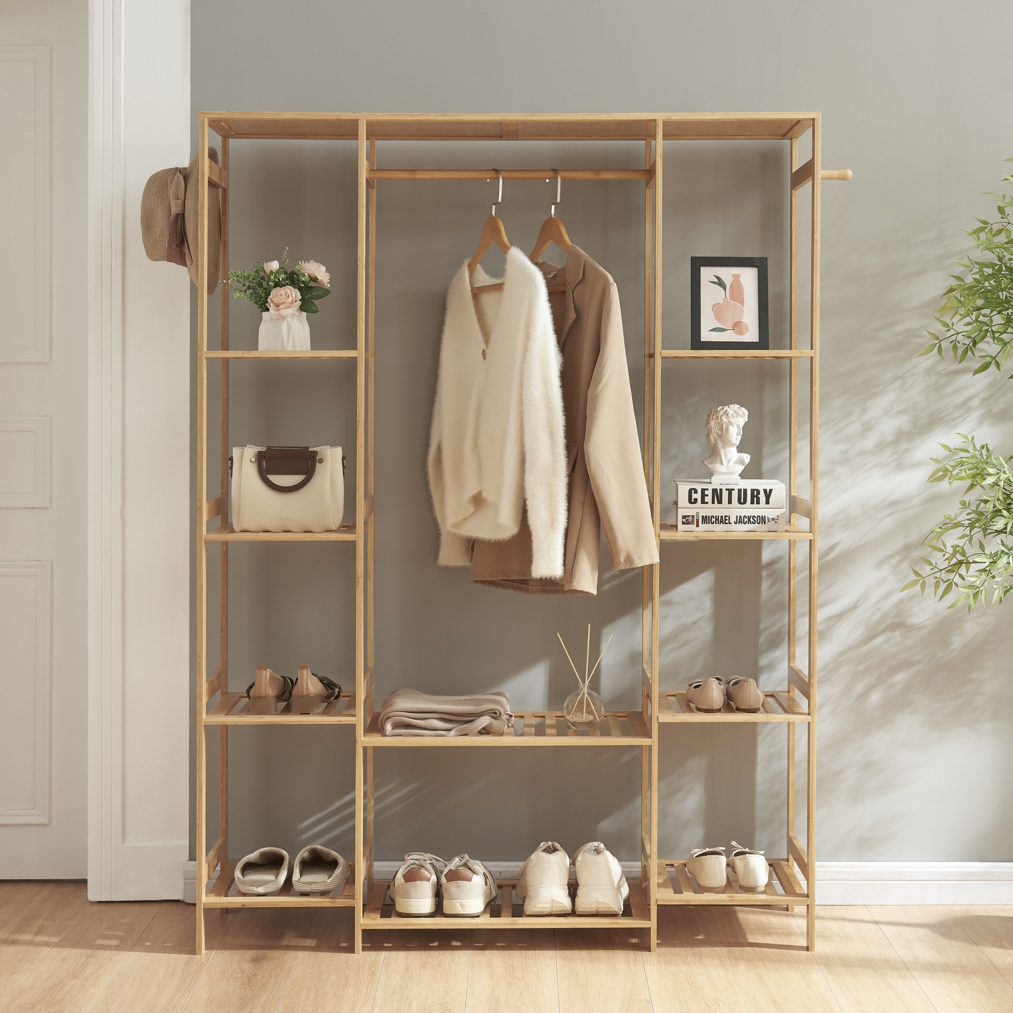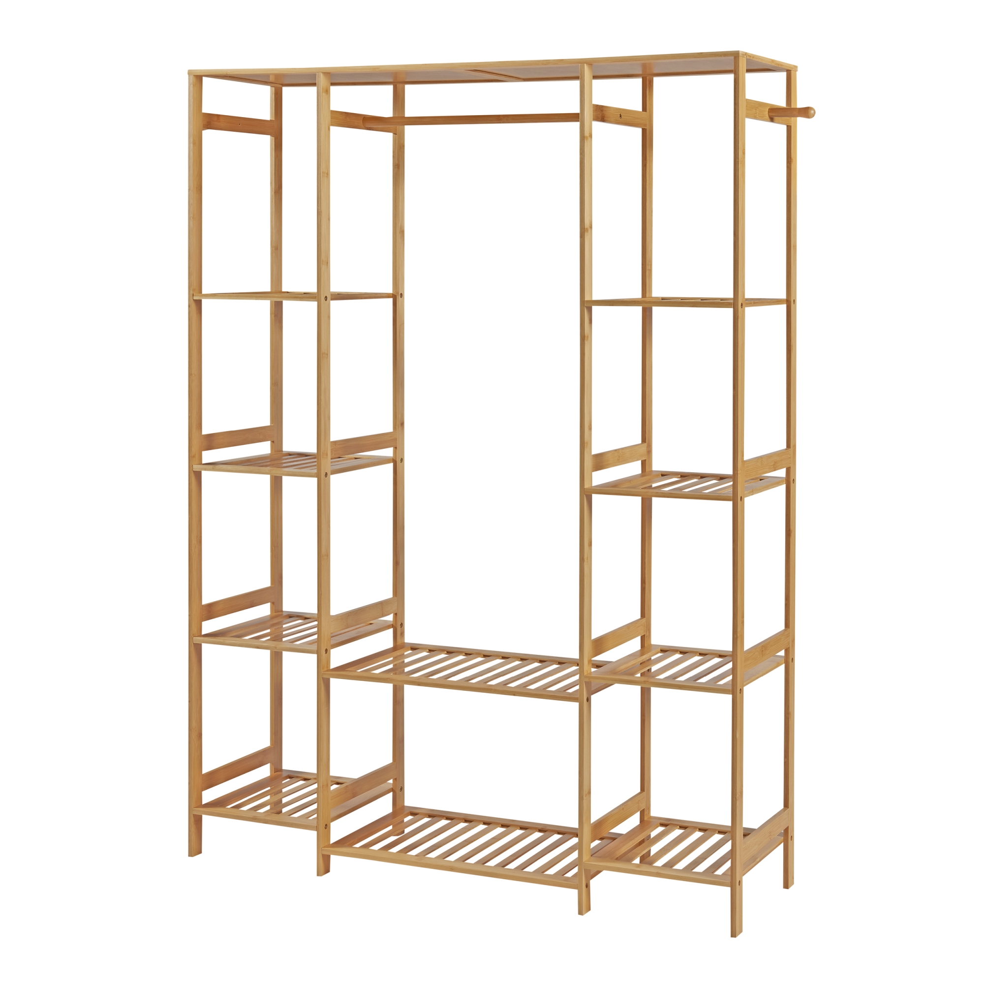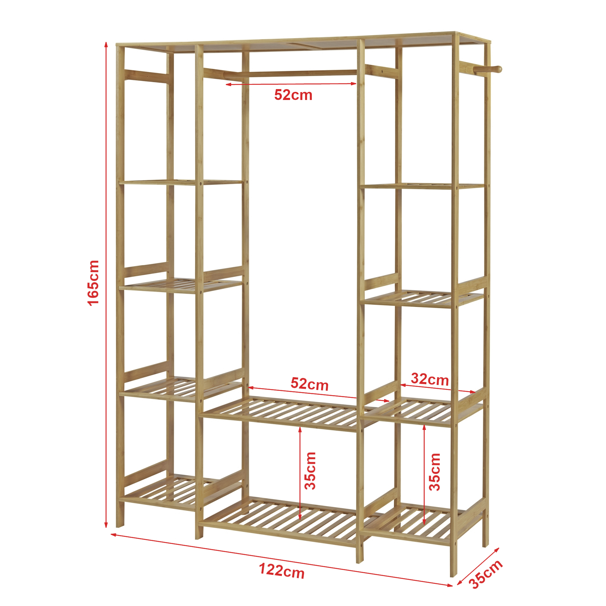 Acest cuier din bambus este prevazut cu o bara pentru umerase, doua polite centrale generoase si cate un raft lateral cu patru compartimente deschise pe fiecare parte. In plus, cele doua carlige laterale sunt ideale pentru palarii, esarfe sau umbrele. Este alegerea potrivita daca iti doresti un suport pentru haine stabil, versatil si usor de integrat in amenajari moderne.