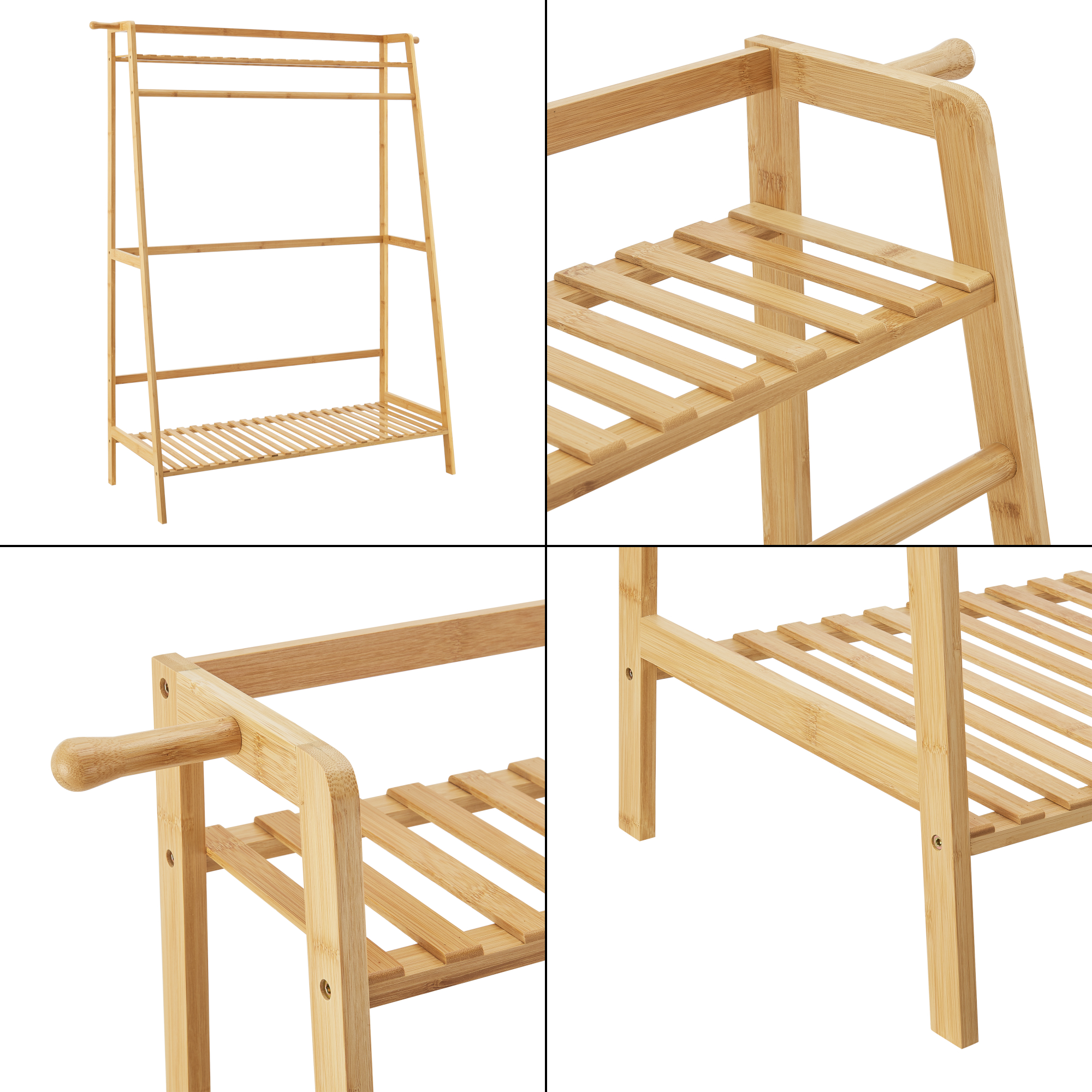 Prevăzut cu bară pentru umerașe, 2 rafturi de depozitare și 2 cârlige laterale, acest suport pentru haine vă ajută să păstrați la îndemână hainele de zi cu zi, gențile, pălăriile sau încălțămintea. Construcția din bambus natural este stabilă, rezistentă și prietenoasă cu mediul, iar montajul se realizează rapid și ușor.
