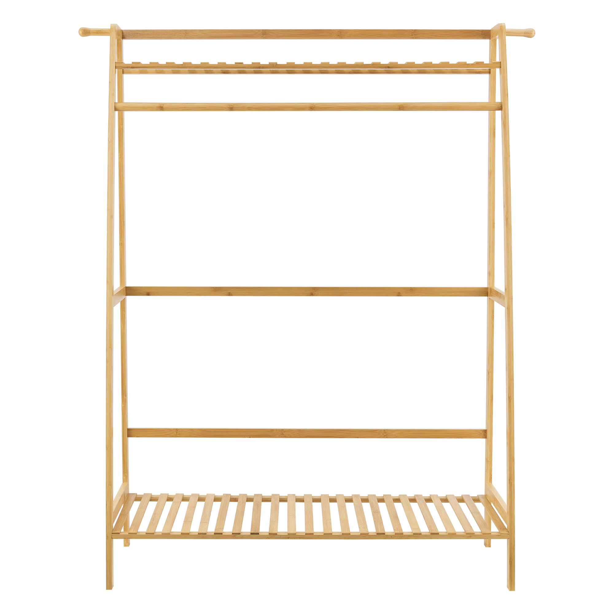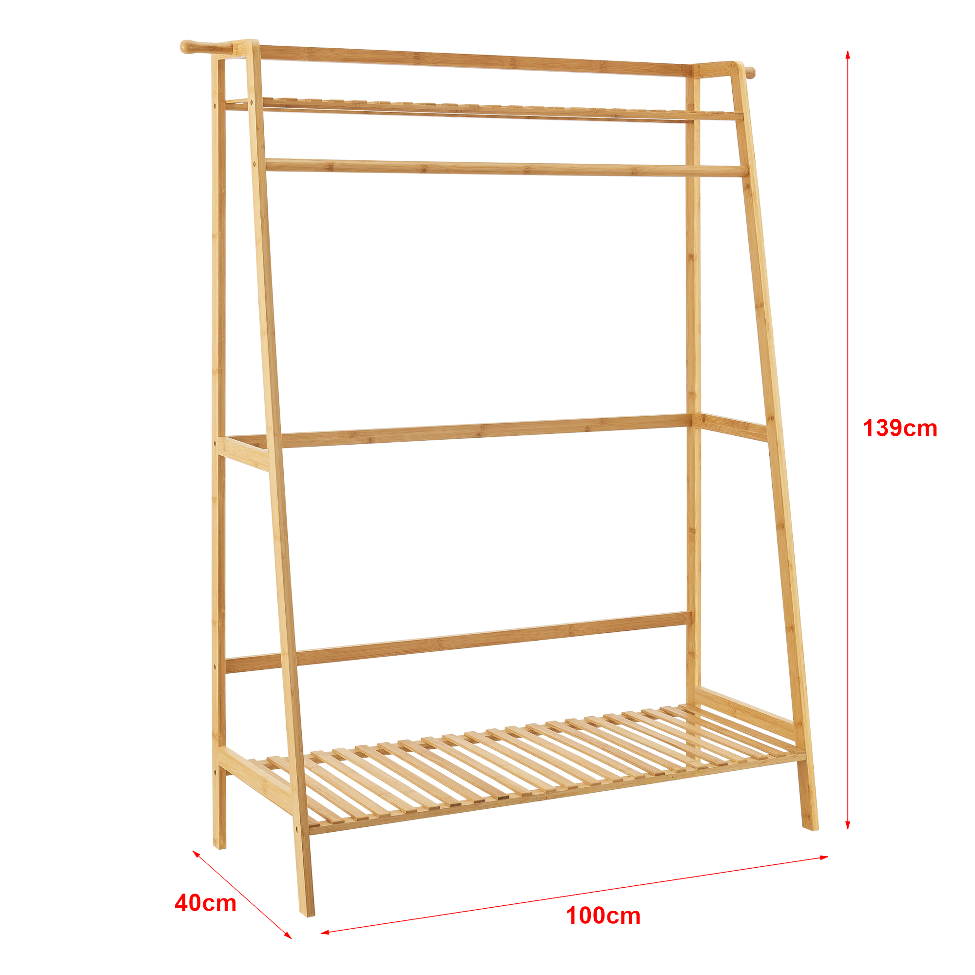 Cuier tip stativ din bambus natural cu 2 rafturi, 139 x 100 x 40 cm