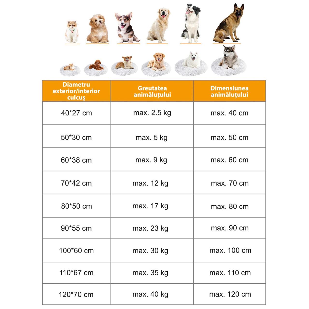 Optiuni de marime disponibile - Luati in considerare tabelul de mai jos pentru a gasi culcusul potrivit animalului dumneavoastra. Luati in considerare atat diametrul exterior, cat si cel interior.