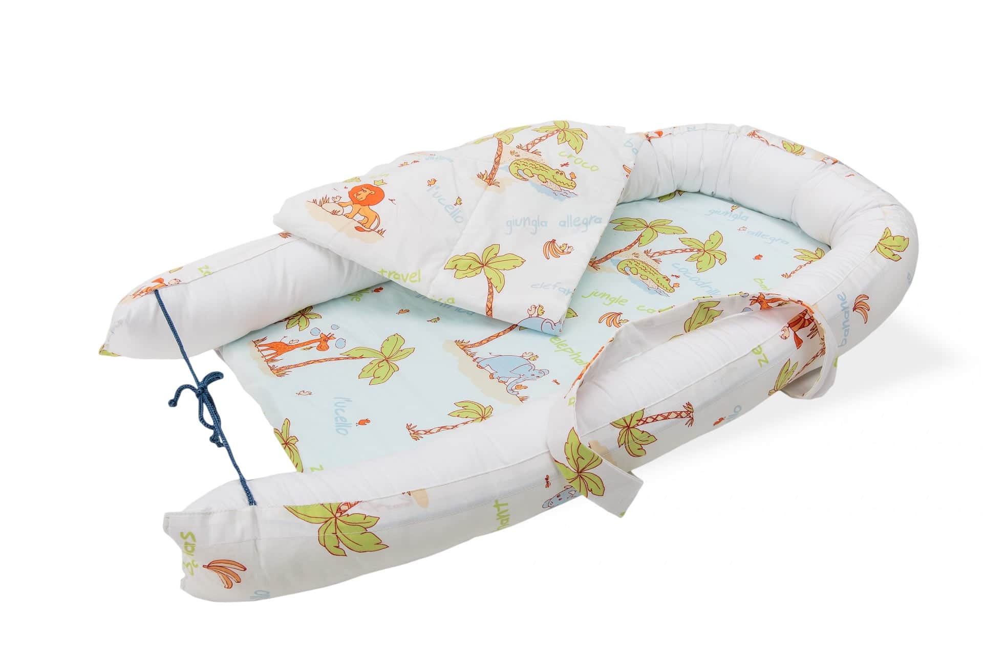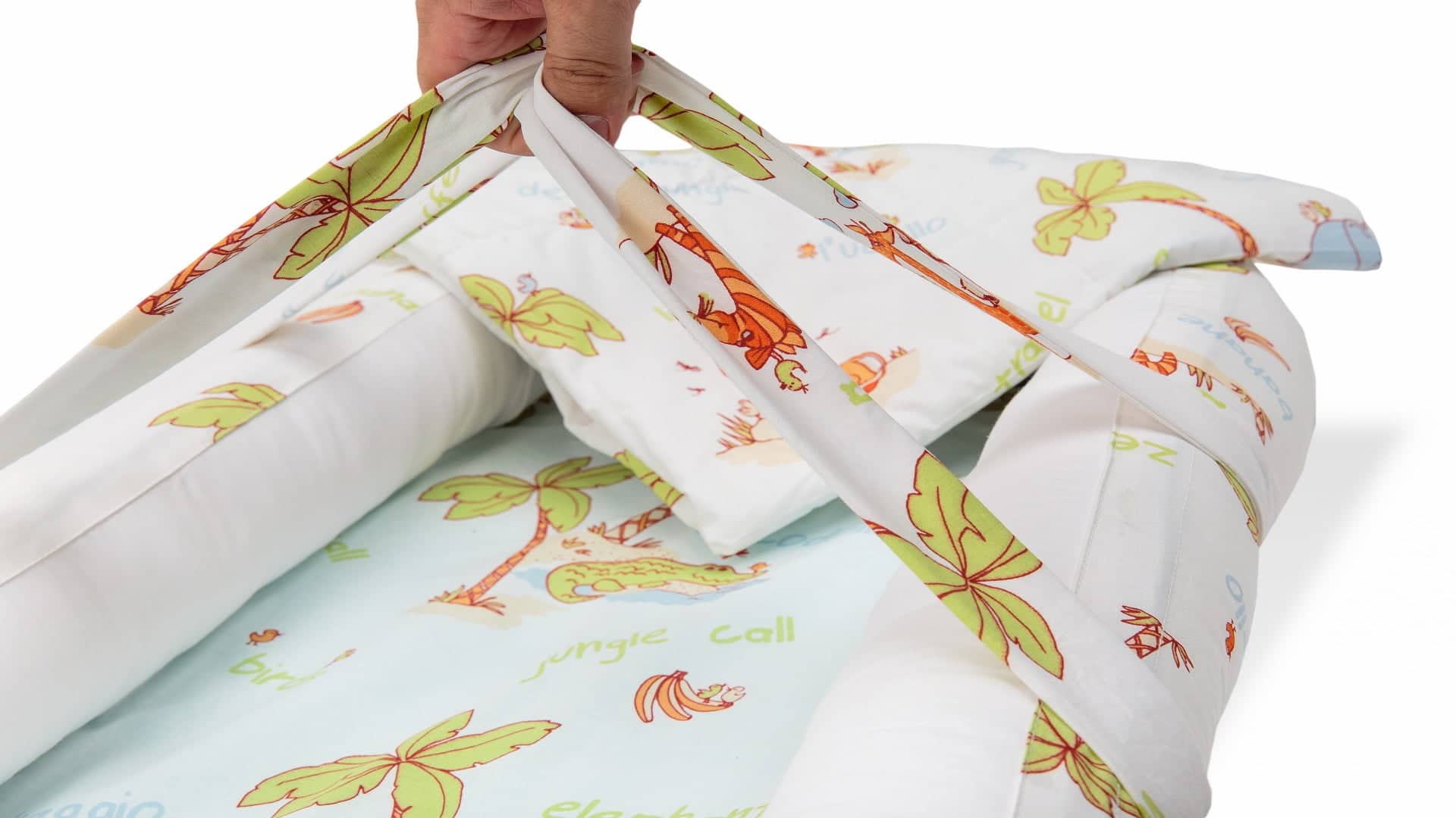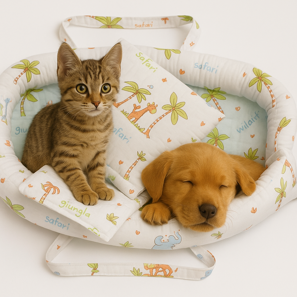 Designul vesel, inspirat din universul safari, se potriveste usor in orice locuinta, iar structura usoara il face simplu de mutat in casa, in cusca de transport sau in calatorii. Setul include cosulet, salteluta si paturica, pentru un plus de confort in fiecare zi.