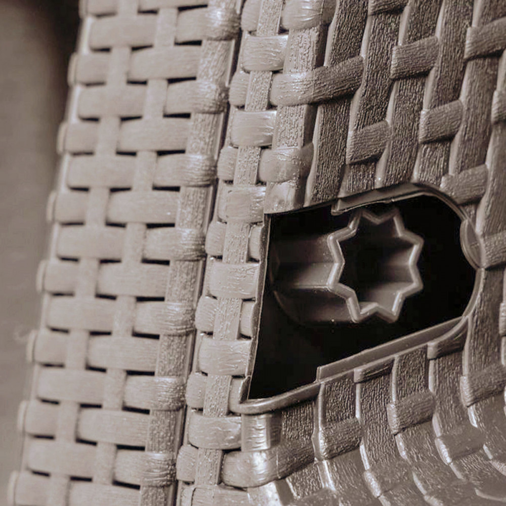 Setul practic de mobilier de grădină din plastic este o combinație din mai multe piese de mobilier. O canapea de colț spațioasă are spătare frumos conturate și cotiere confortabile. Setul include o măsuță de cafea practică unde puteți lua cina în aer liber cu familia. Canapeaua de colț este dotată cu perne confortabile, cu huse de pernă cu fermoar, astfel încât husele de pernă pot fi spălate cu ușurință. În plus, o caracteristică practică a setului de grădină cu masă este că brațele sunt la o înălțime care permite amplasarea fotoliilor sub masă, ceea ce economisește spațiu.