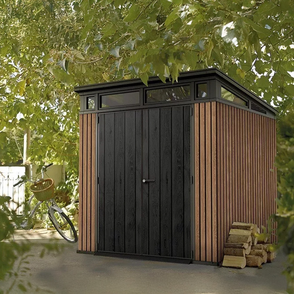 Panourile din plastic fabricate cu tehnologia Decocoat creează un efect natural de lemn, fiind în același timp complet lipsite de întreținere. Structura din oțel ranforsat asigură stabilitate, iar ușa cu lacăt oferă protecție suplimentară. Dimensiuni: 216x218x226 cm