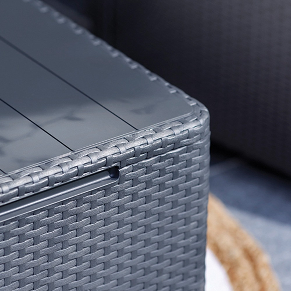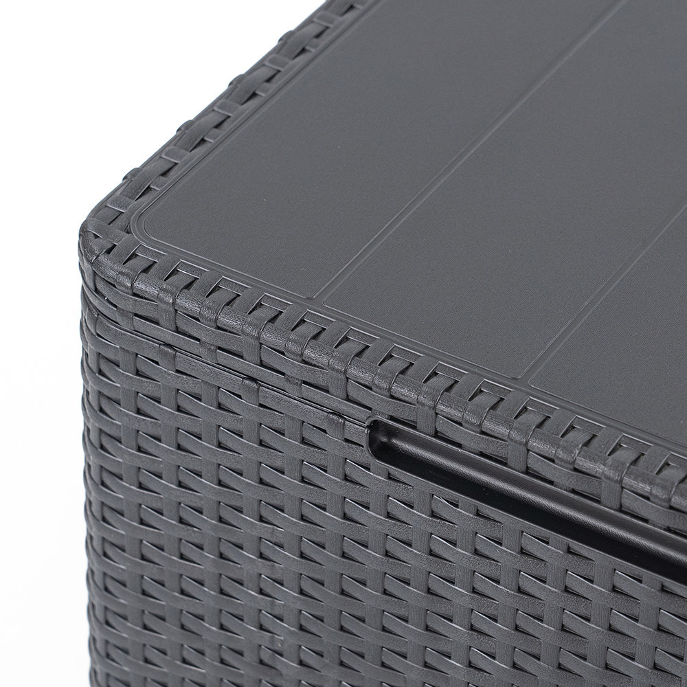 Aceasta este o masă elegantă, cu un suport pentru perne care amintește de stilul ratan. Această piesă de mobilier va face plăcute zilele de vară petrecute în grădină sau pe terasă. Această piesă de mobilier va aduce culoare în fiecare zi a ta prin aspectul său plăcut. Cu această masă de depozitare, vă puteți păstra pernele uscate și în siguranță atunci când nu folosiți mobilierul de grădină. Masa pătrată de grădină este acoperită cu o husă originală care imită împletitura din ratan. Masa cu spațiu mare de depozitare este ideală și pentru grădini, terase și interioare. Foarte ușor de asamblat și curățat. Este rezistent la condițiile meteorologice și la radiațiile UV.