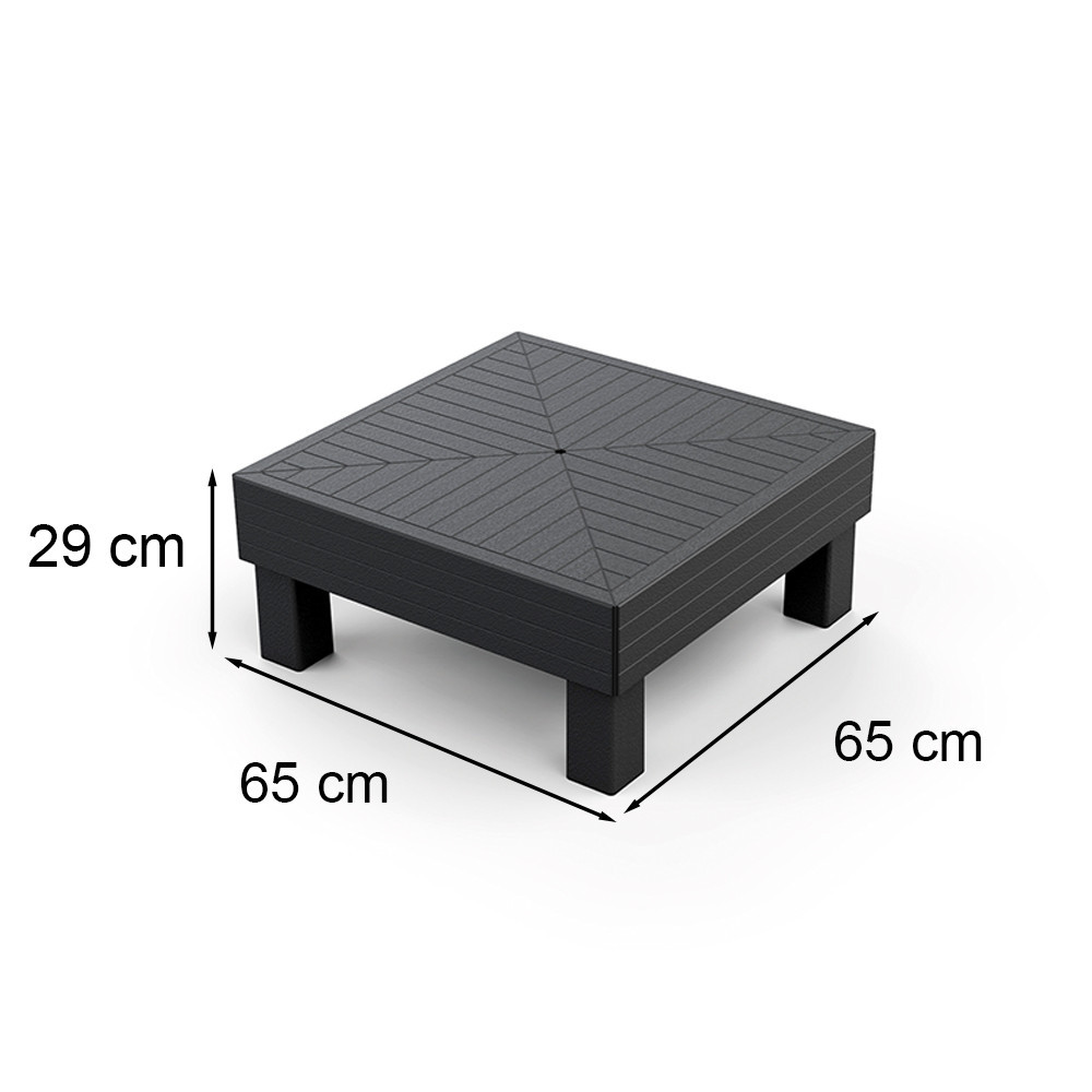 Masa de 65 cm x 65 cm și 29 cm este fabricată din materiale de înaltă calitate, rezistente la intemperii, care garantează o durată lungă de viață și o întreținere ușoară. Datorită rezistenței sale la radiațiile UV, culoarea mesei nu se va decolora și își va menține calitatea chiar și atunci când este utilizată în exterior.