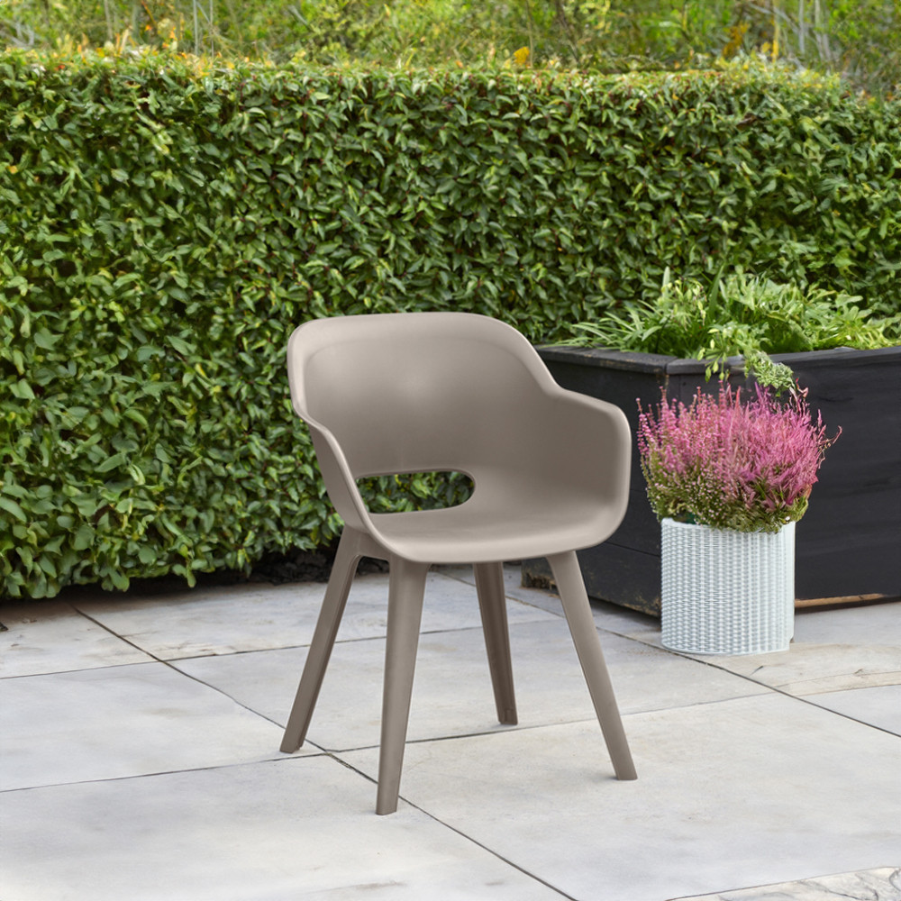 Scaunul de grădină Akola Duo în culoarea cappuccino are o formă unică, cu spătar și cotiere rotunjite.