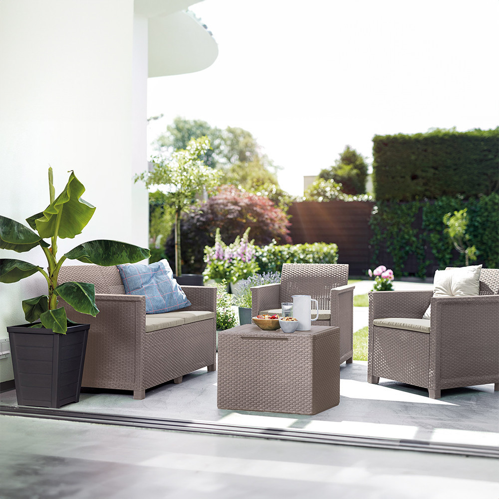 Acest set de mobilier de grădină cu efect de ratan în culoarea cappuccino include două fotolii, o canapea cu 2 locuri și o masă multifuncțională, toate fabricate din plastic rezistent la intemperii, așa că nu trebuie să vă faceți griji cu privire la efectele radiațiilor UV.