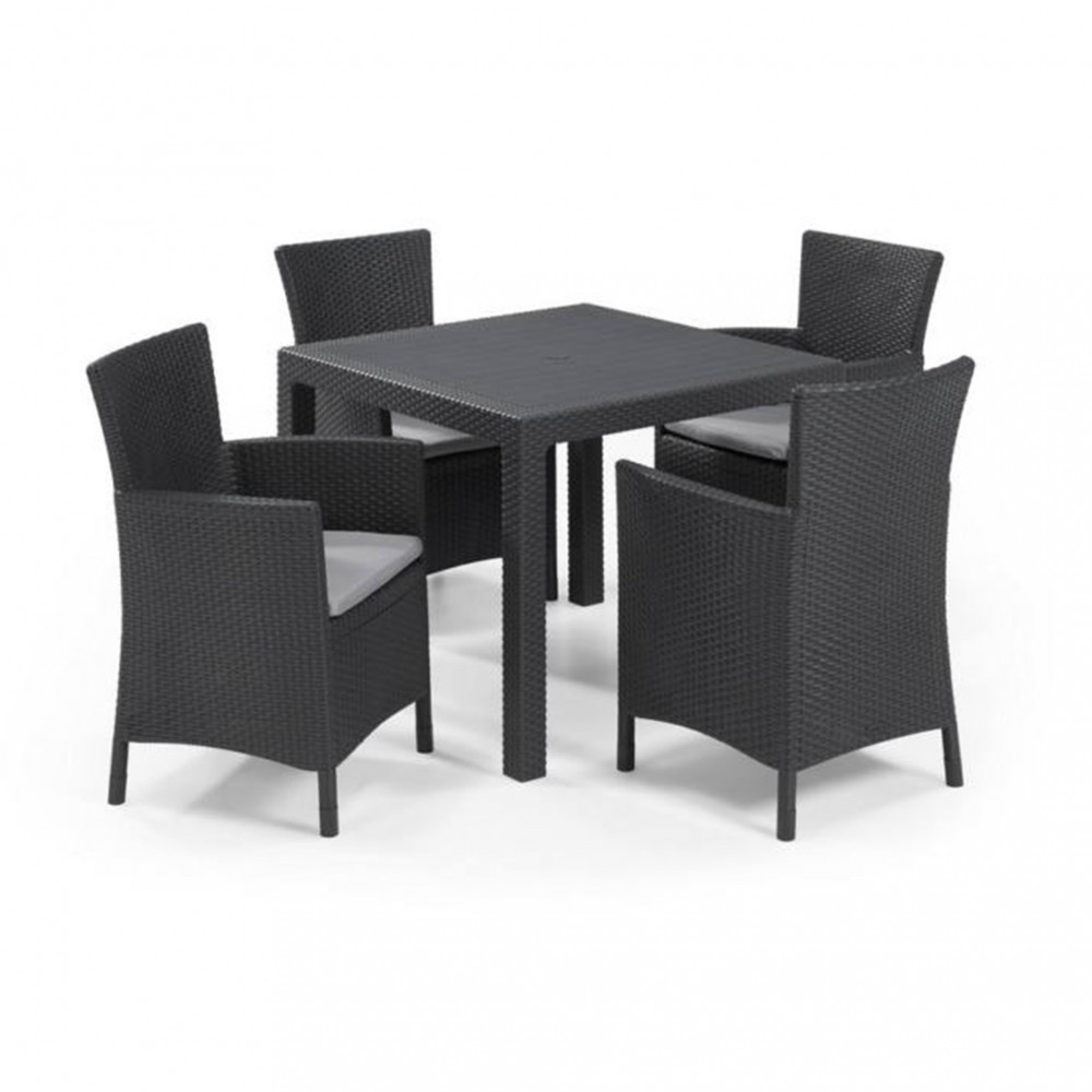 Set de mobilier de grădină Quartet; care include o masă Quartet și patru fotolii Iowa cu perne asortate. Originalul; Suprafața asemănătoare ratanului va satisface chiar și cei mai exigenți utilizatori. Produsul este foarte ușor de asamblat și întreținut. Suprafața mobilierului este rezistentă la umiditate și radiații UV; ceea ce garantează o durată lungă de viață. Mobila din ratan ajunge asamblată pe o placă.
