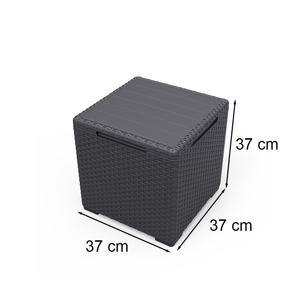 Masa de grădină Vigo cu spațiu de depozitare este alegerea perfectă dacă sunteți în căutarea unui mobilier multifuncțional pentru terasa sau balconul dumneavoastră. Masa din plastic de culoarea grafitului, cu efect de ratan, nu este doar un plus unic și modern pentru terasa ta, ci servește și ca spațiu util de depozitare.