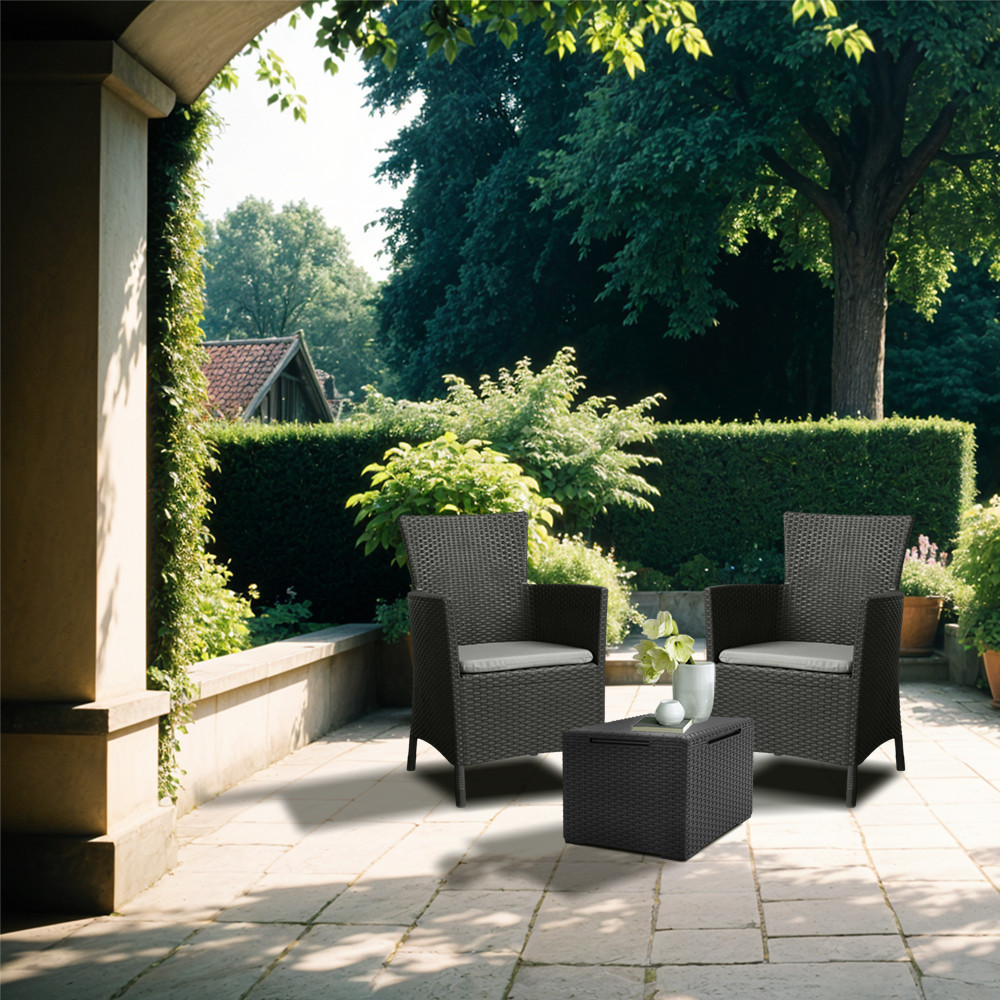 Reimaginează-ți balconul cu setul de mobilier de grădină Iowa Balcony , care combină designul modern cu funcționalitatea. Acest set elegant include o masă practică de grădină Vigo cu spațiu de depozitare și fotolii confortabile de grădină Trenton din ratan sintetic, toate fiind rezistente la intemperii și nu necesită întreținere, asigurând un confort de lungă durată.