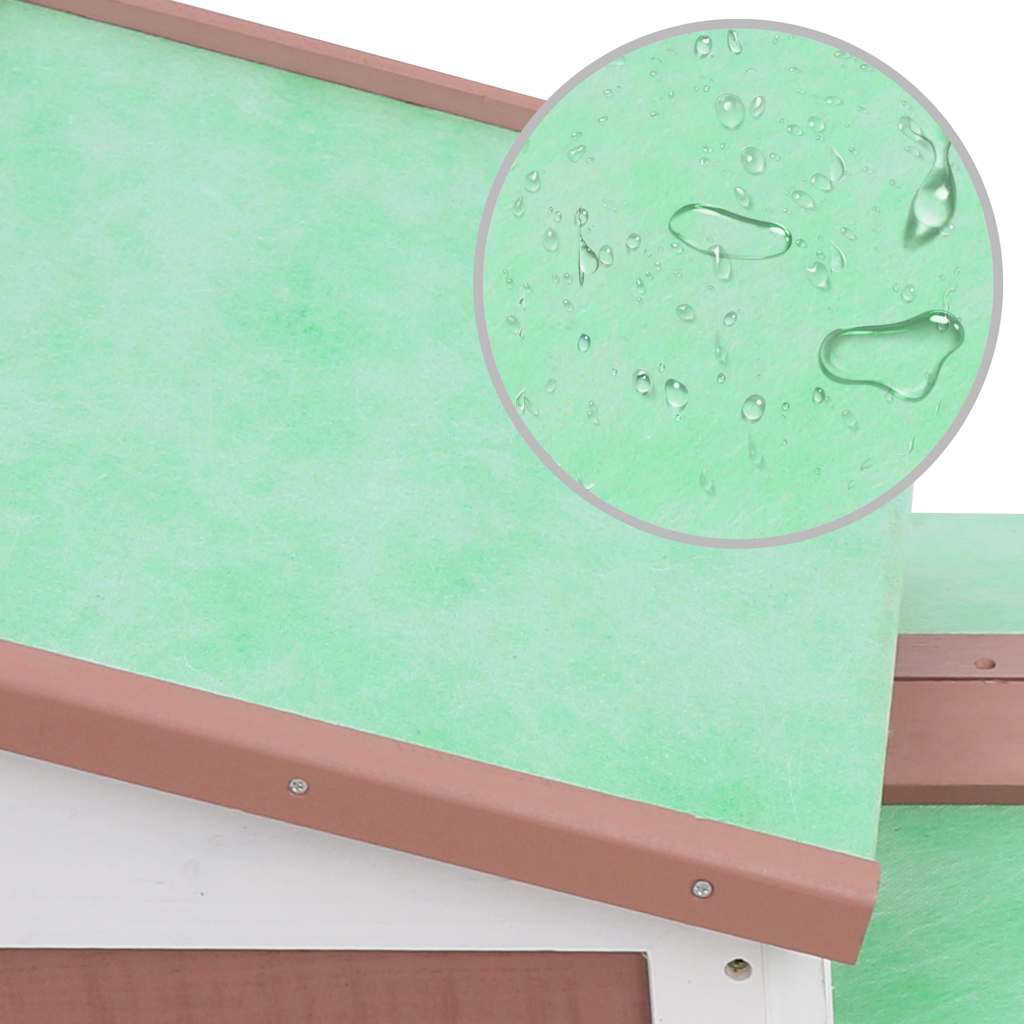 Este construită din lemn de brad masiv vopsit, care are o durată lungă de utilizare și este sigur pentru animale. Acoperișul din bitum vă protejează prietenii blănoși de fenomenele meteo. Stinghia înălțată menține animalele mici în siguranță, uscate și la căldură, în special în zilele ploioase. Animalele de companie pot intra ușor în căsuța de sus cu ajutorul unei rampe incluse. Proiectată pentru o întreținere simplă, căsuța conține o tavă cu cădere detașabilă pentru o curățare ușoară. Zona de exterior, cu plasă de gard durabilă, asigură o ventilație suficientă și ține animalele de companie înăuntru, iar prădătorii afară. Ușile blocabile protejează animalele de companie și vă permit să le așezați în interior și să le luați la exterior cu ușurință.