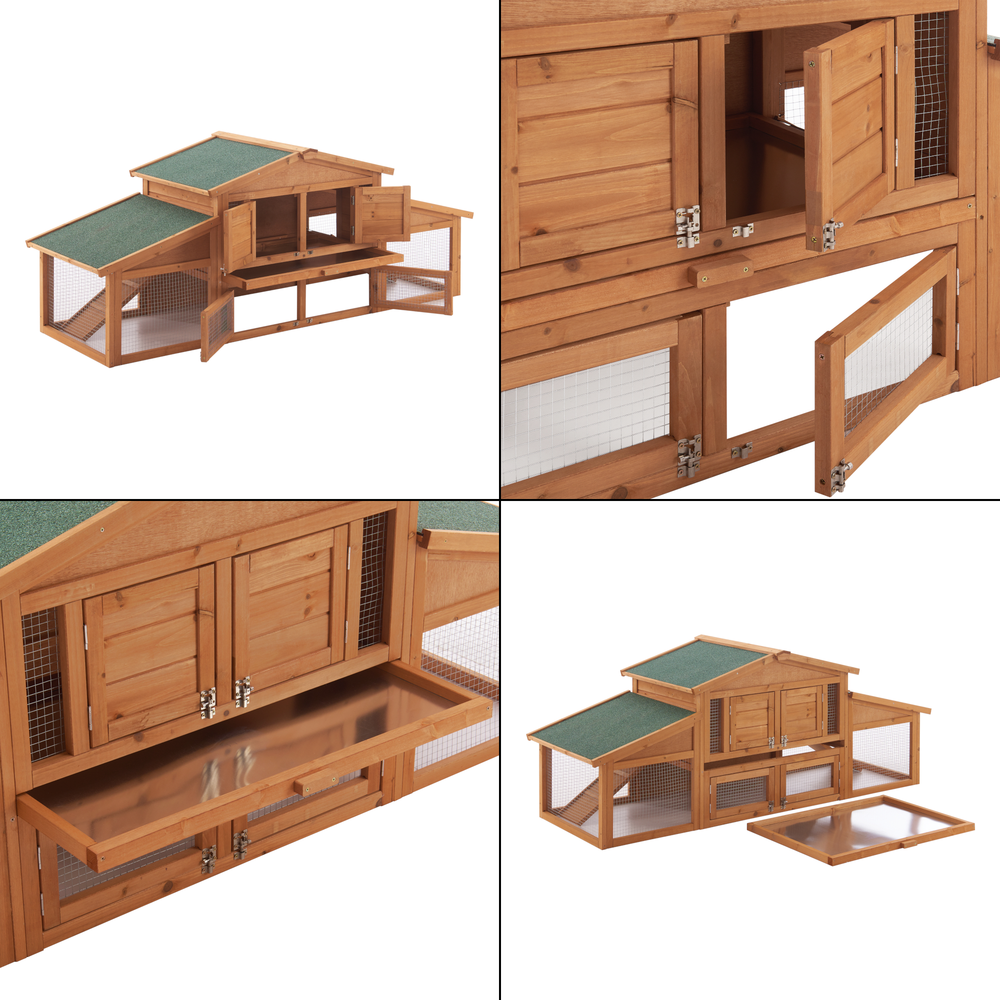 Datorită celor două rampe integrate, animalele se pot deplasa ușor între zona de relaxare și spațiul de mișcare. Ferestrele și ușile separate oferă acces facil, iar plasa metalică permite o bună ventilație și vizibilitate permanentă. Acoperișul complet, cu înveliș din bitum, ajută la protejarea împotriva intemperiilor și face produsul potrivit pentru utilizare în exterior.