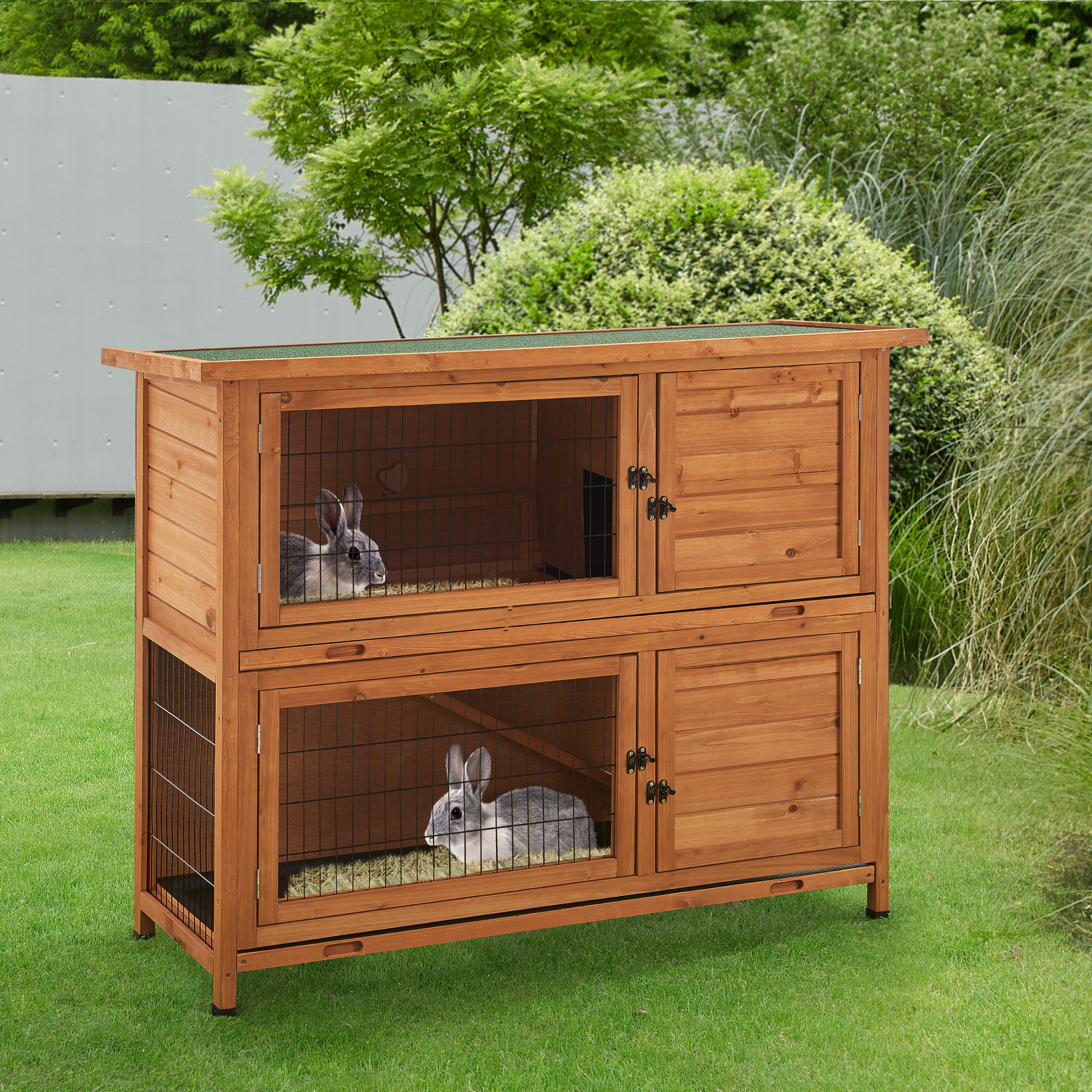 Această cușcă din lemn pentru iepuri este potrivită pentru adăpostirea animalelor mici în exterior. Poate fi folosită zilnic ca spațiu de odihnă, adăpost și mișcare, fiind ușor de întreținut datorită podelelor detașabile și accesului comod prin ușile frontale.