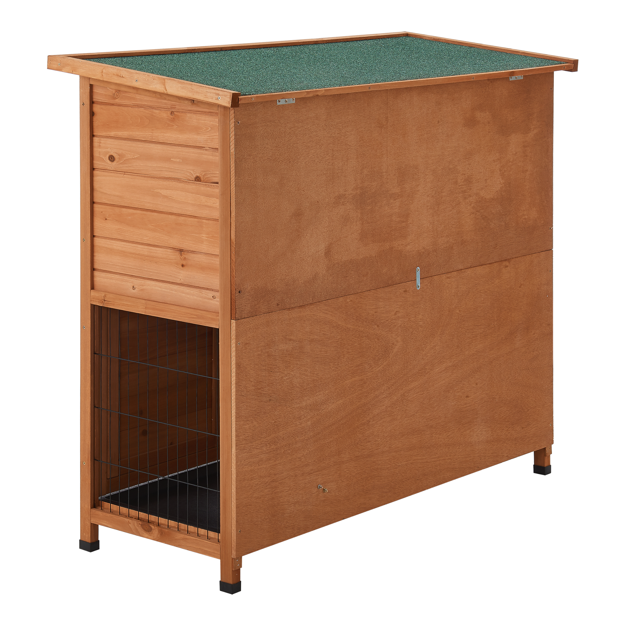 Realizată din lemn de brad, această cuscă iepuri exterior este prevăzută cu uși cu grilaj pentru o bună circulație a aerului și pentru vizibilitate sporită. Acoperișul rezistent, acoperit cu bitum, ajută la protecția împotriva umezelii, iar picioarele înălțate reduc contactul direct cu solul rece sau umed.