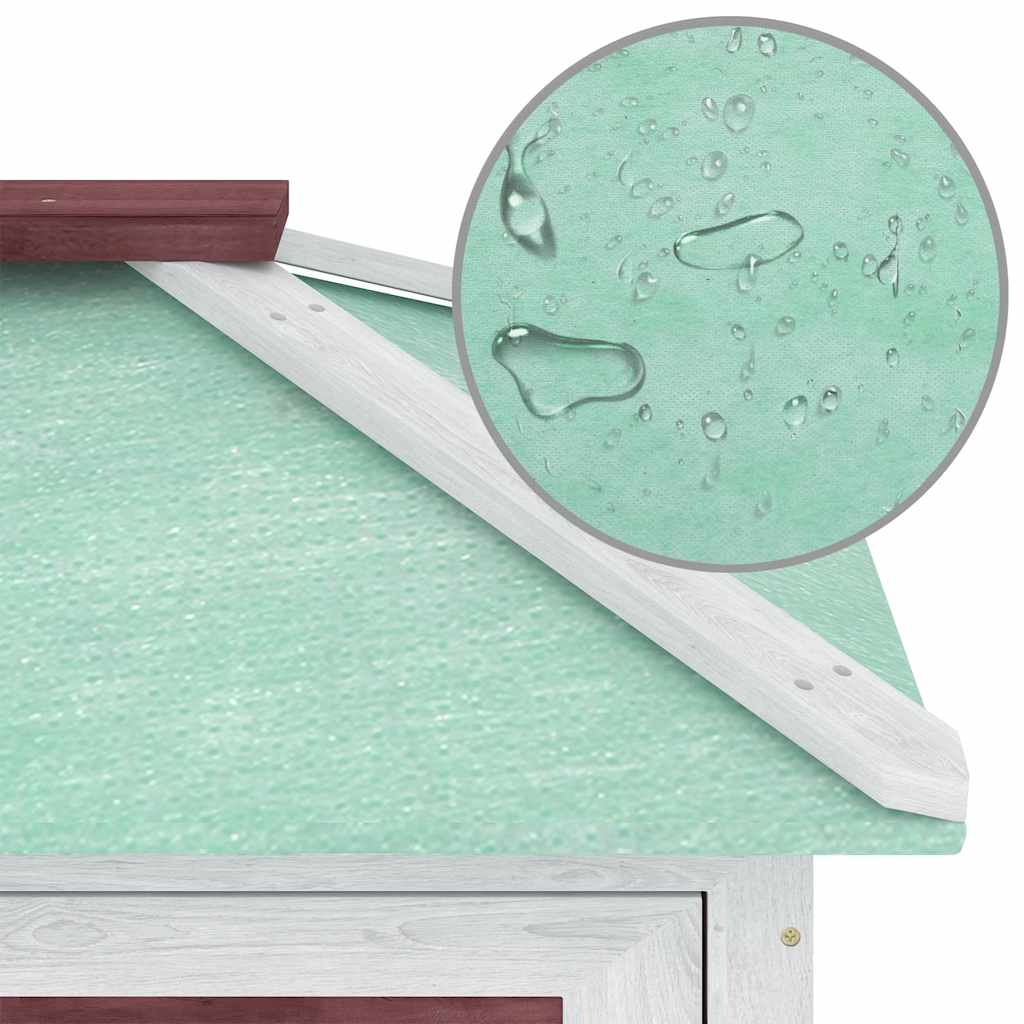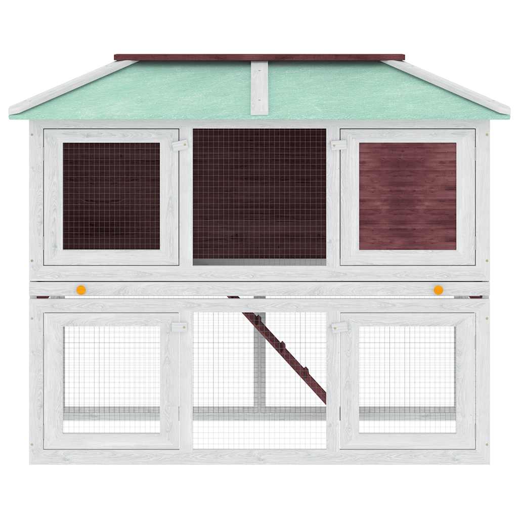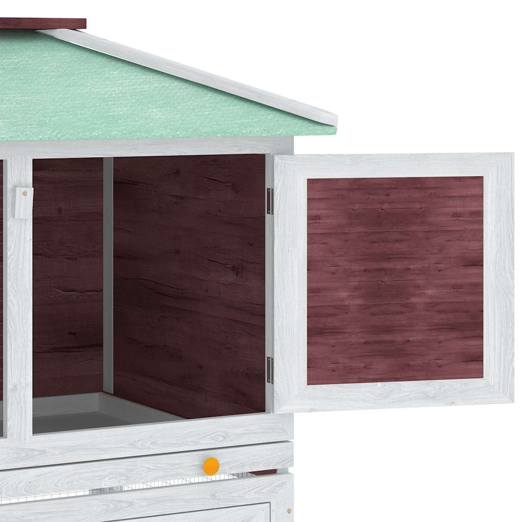 Cușca pentru animale este construită cu un cadru din lemn de brad, pentru o utilizare îndelungată. Acoperișul verde asigură protecție împotriva ploii, în timp ce culcușul confortabil este locul perfect pentru dormit. Scara ușor de urcat asigură legătura cu nivelul superior. Tava detașabilă facilitează curățarea. Ușile se închid cu ușurință. Această cușcă pentru iepuri, din lemn, este perfectă pentru animale de companie mici.