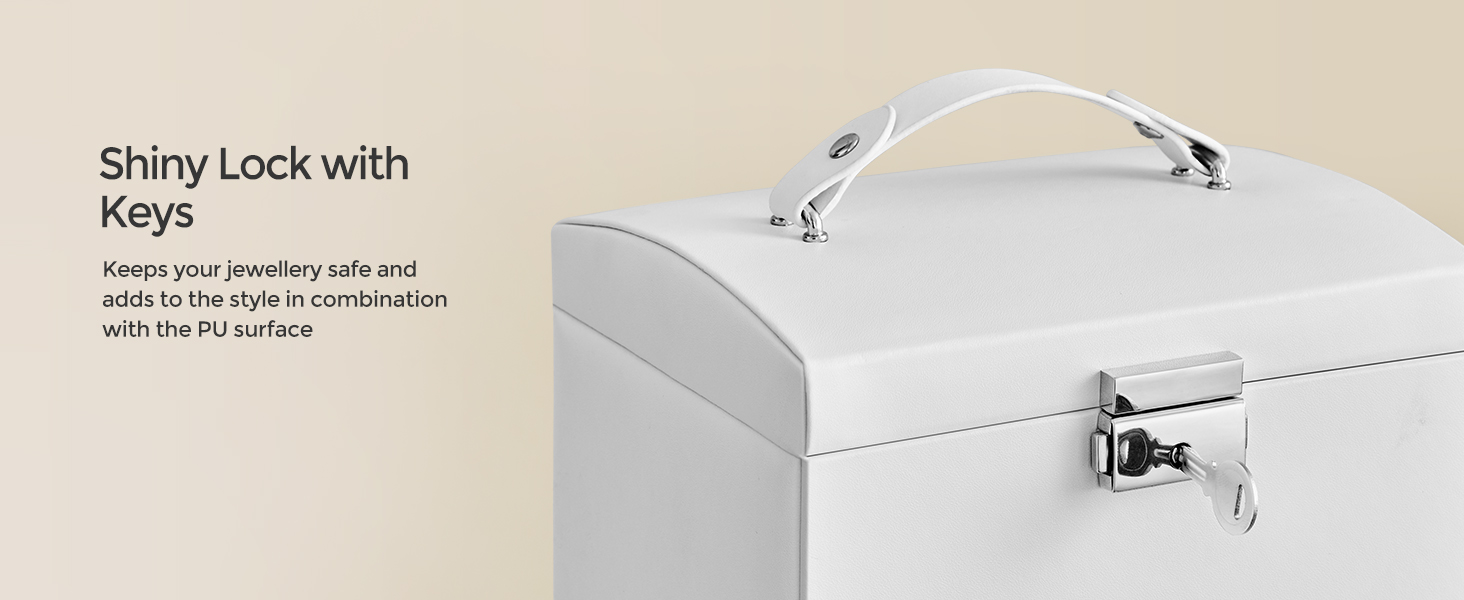 Modelul are 3 niveluri de depozitare, 2 sertare și compartimente variate, astfel încât să poți separa ușor fiecare tip de accesoriu. Ușile laterale includ cârlige pentru coliere, iar oglinda interioară te ajută să probezi rapid bijuteriile sau să îți verifici look-ul înainte de plecare. În plus, cutia de bijuterii cu încuietoare vine cu 2 chei, pentru un plus de siguranță, iar mânerul superior o face ușor de transportat.