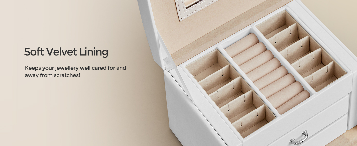 Este potrivită pentru dormitor, dressing sau masă de toaletă, dar și pentru călătorii scurte. Poți depozita separat bijuteriile de zi cu zi și piesele speciale, având totul la îndemână într-un singur loc.