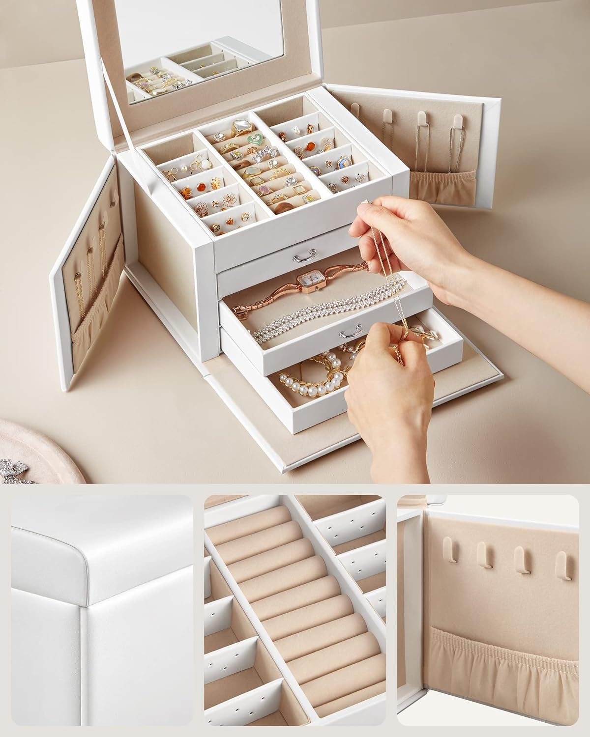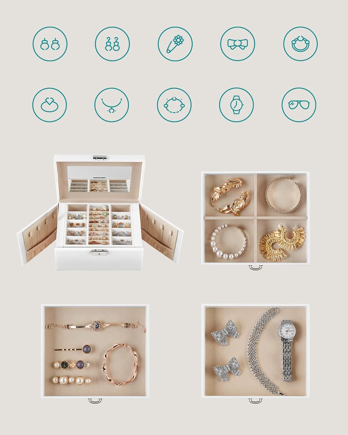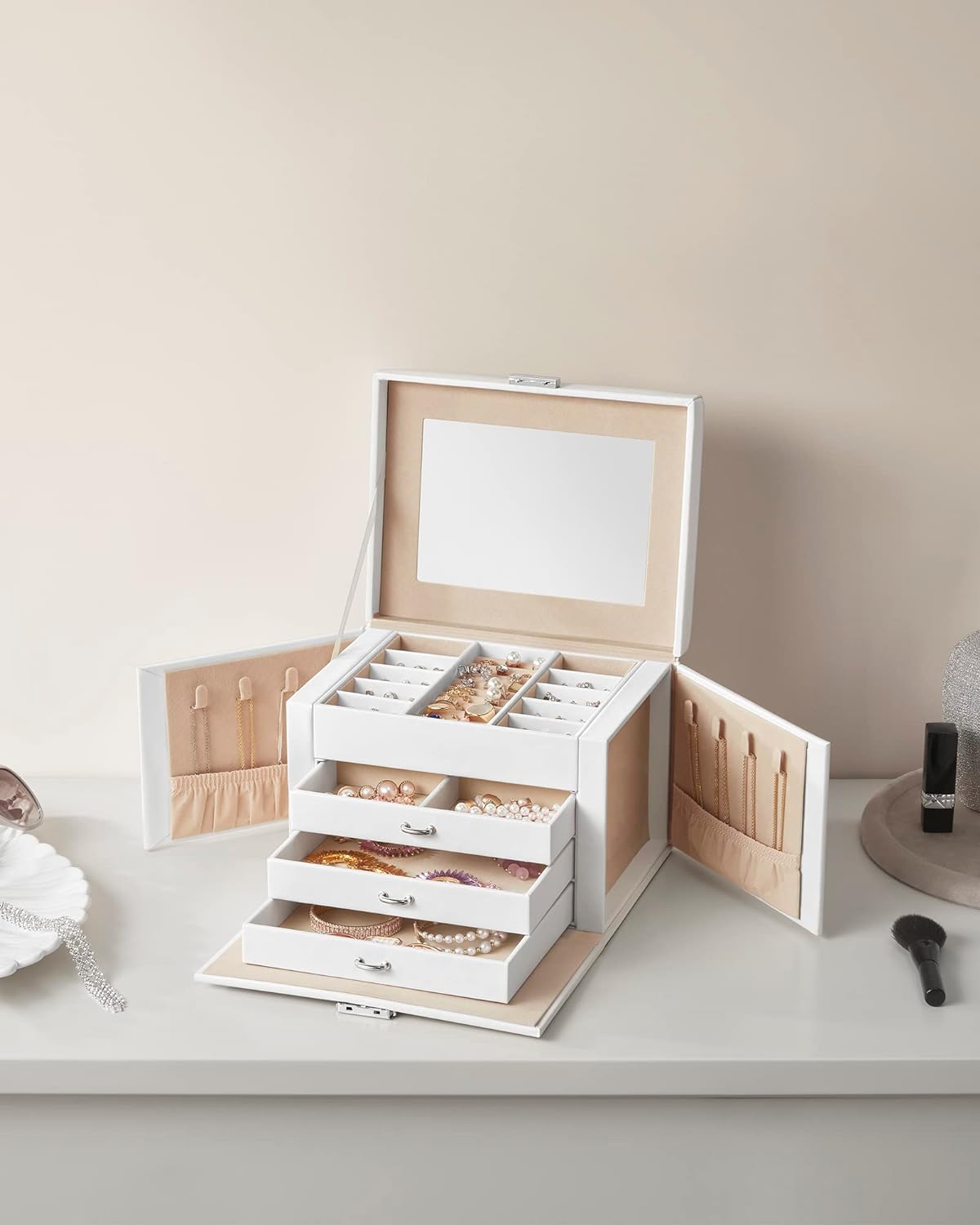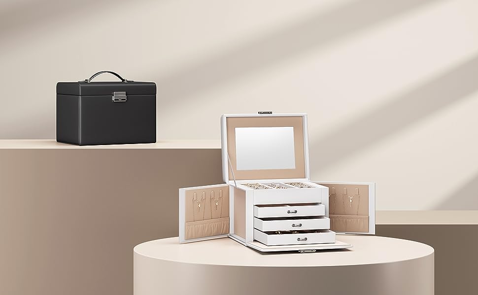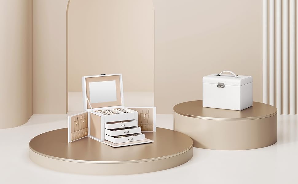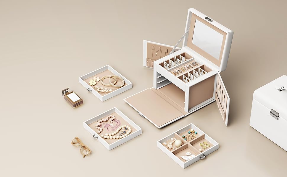 Păstrează fiecare accesoriu în ordine cu această cutie de bijuterii Songmics, elegantă și practică, realizată pentru organizarea eficientă a inelelor, cerceilor, colierelor și brățărilor. Designul alb, finisajul din piele ecologică și interiorul catifelat oferă un aspect rafinat, iar compartimentarea pe 4 niveluri te ajută să găsești rapid bijuteriile preferate. Oglinda integrată și sistemul de închidere cu cheie completează perfect un organizator util pentru acasă sau pentru deplasări.