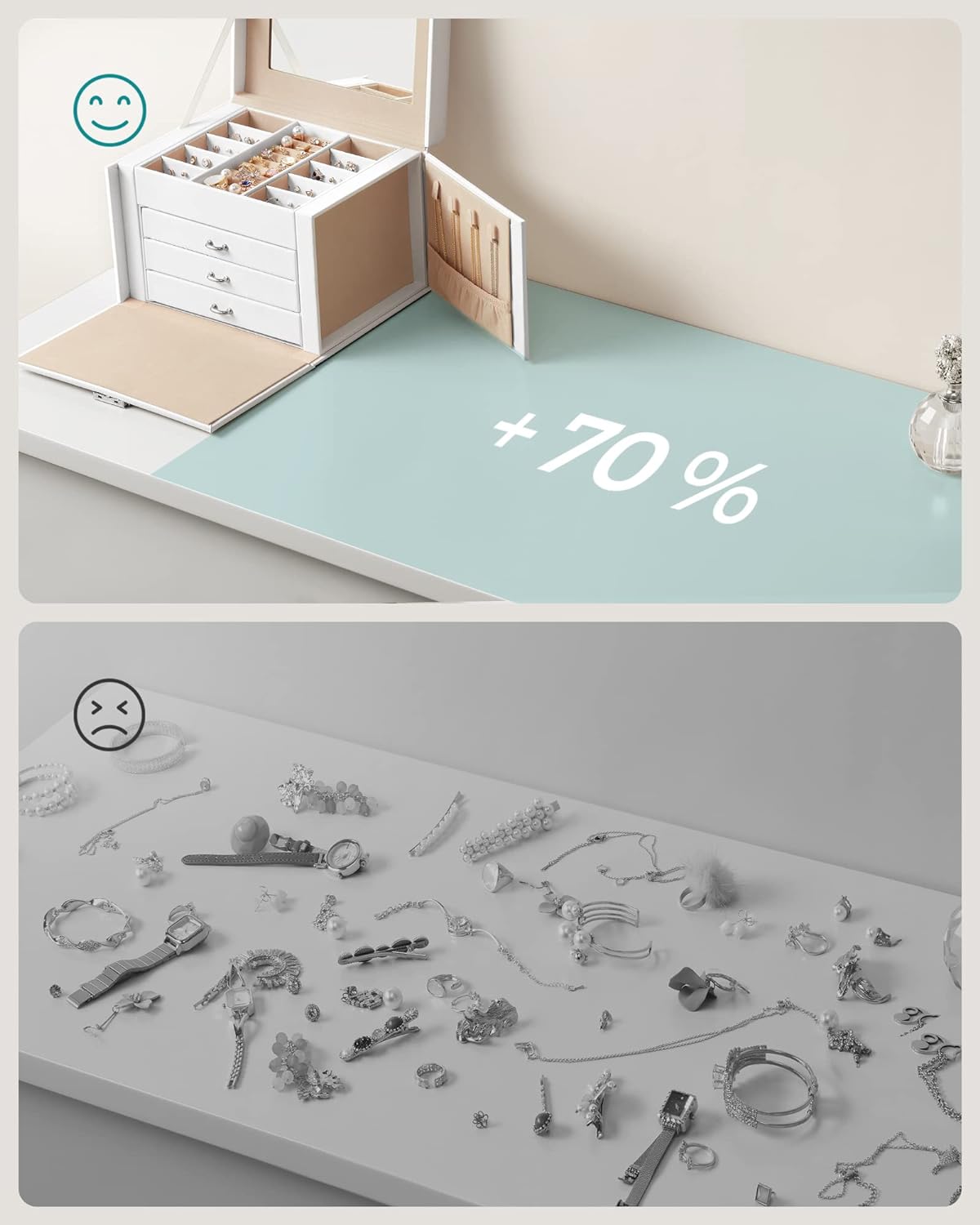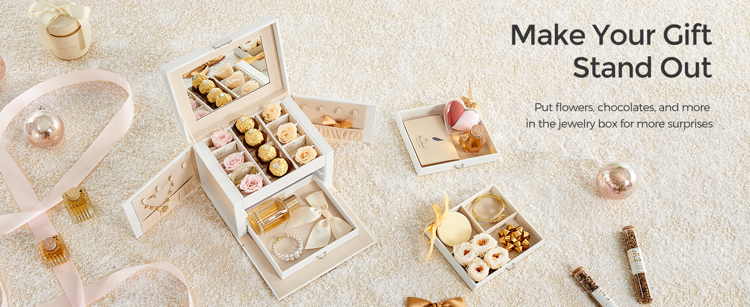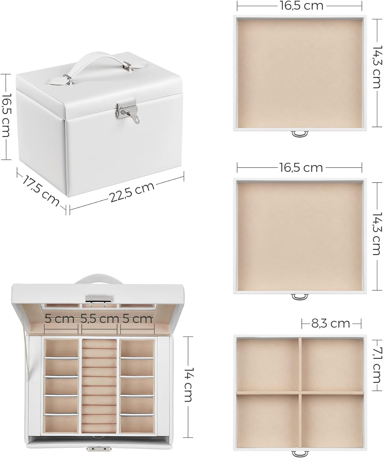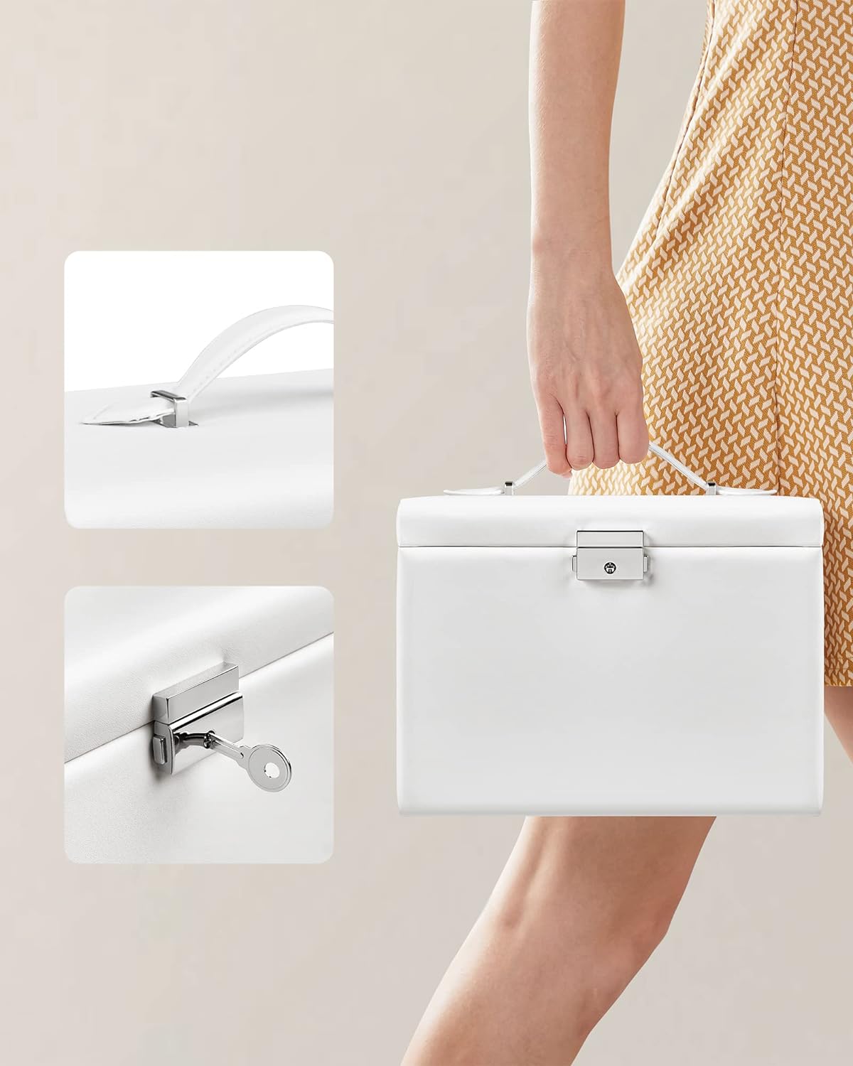 Păstrează fiecare accesoriu în ordine cu această cutie de bijuterii Songmics, elegantă și practică, realizată pentru organizarea eficientă a inelelor, cerceilor, colierelor și brățărilor. Designul alb, finisajul din piele ecologică și interiorul catifelat oferă un aspect rafinat, iar compartimentarea pe 4 niveluri te ajută să găsești rapid bijuteriile preferate. Oglinda integrată și sistemul de închidere cu cheie completează perfect un organizator util pentru acasă sau pentru deplasări.