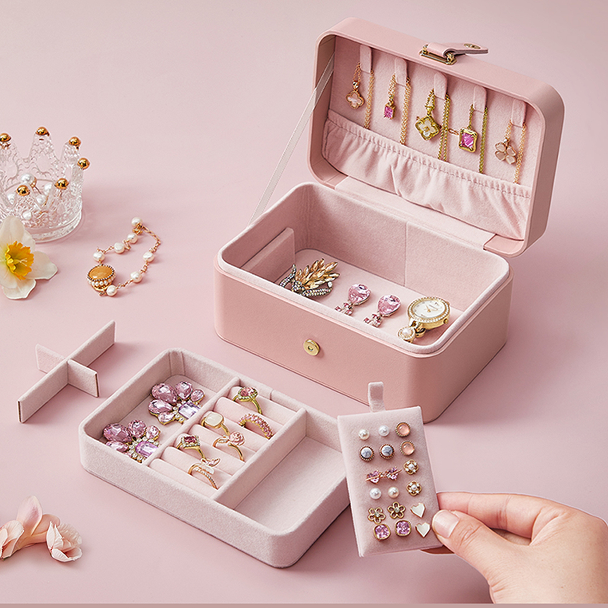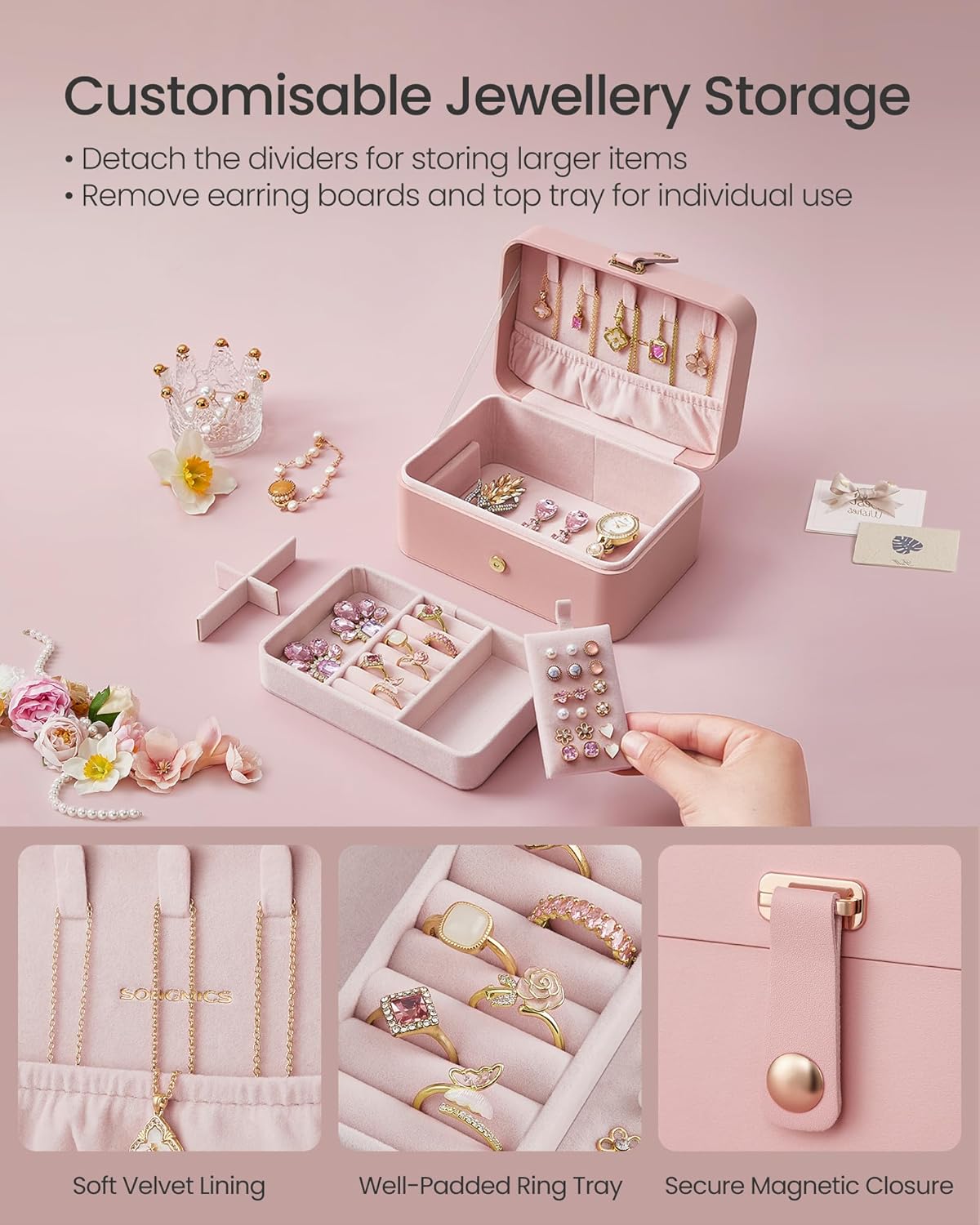 Pastreaza-ti accesoriile preferate in ordine cu aceasta cutie de bijuterii SONGMICS GISELLA, practica si eleganta. Designul compact, in nuanta roz, este perfect pentru acasa sau in deplasare, iar organizarea pe 2 niveluri iti ofera acces rapid la inele, cercei, bratari si coliere. Interiorul captusit cu catifea protejeaza bijuteriile impotriva zgarieturilor, in timp ce inchiderea cu buton magnetic mentine continutul in siguranta.