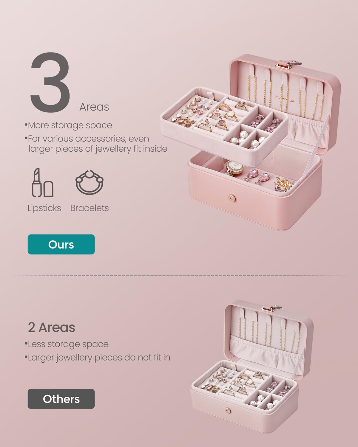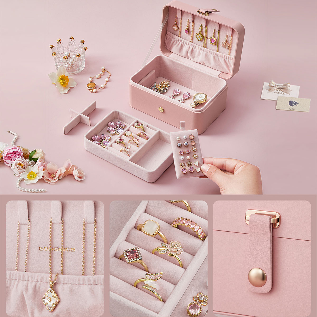 Cutie de bijuterii SONGMICS GISELLA, 2 niveluri, compacta, roz, 16x11x8 cm