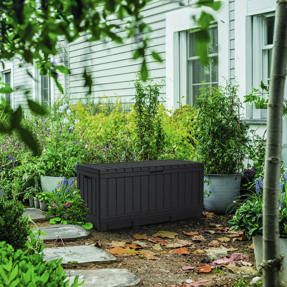 Păstrează terasa și grădina în ordine cu cutia de depozitare pentru grădină Curver Kentwood 350L, un model cu aspect elegant, în nuanță antracit, ideal pentru depozitarea accesoriilor folosite frecvent. Este o soluție practică pentru curte, balcon sau foișor și poate fi folosită și ca bancă pentru ședere.