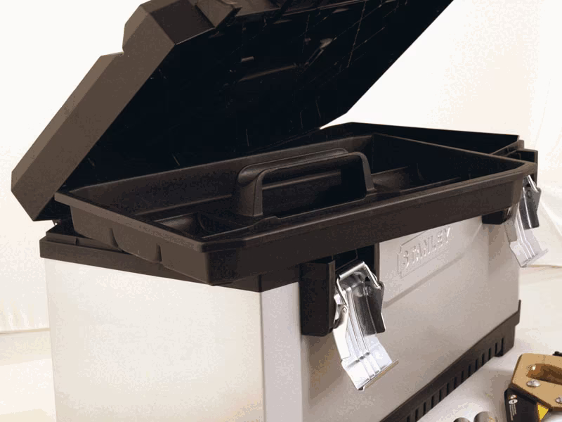 Inchizatorile mari din metal, tratate impotriva ruginii, contribuie la pastrarea continutului in siguranta. In plus, capacul cu canelura in V este util pentru sprijinirea materialelor in timpul lucrului, iar manerul ergonomic bi-material face transportul mai confortabil.