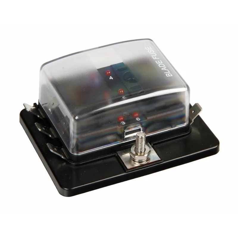 Prevăzută cu 6 LED-uri de semnalizare, această cutie siguranțe cu lamelă indică rapid atunci când o siguranță este întreruptă, astfel încât identificarea problemei se face simplu și rapid. Este compatibilă cu siguranțe plate standard de 5A până la 30A și poate fi utilizată în instalații de 12V sau 24V.