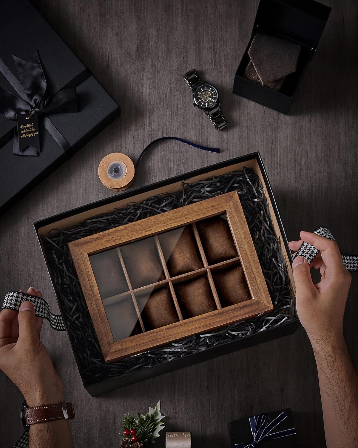 Aceasta cutie depozitare ceasuri ofera spatiu dedicat pentru 8 ceasuri pe nivelul superior, iar sertarul inferior este perfect pentru bratari, inele, butoni sau alte bijuterii. Capacul transparent iti permite sa iti admirI colectia fara sa deschizi cutia, iar finisajul in nuanta nuc rustic adauga un plus de rafinament in dormitor, dressing sau birou.
