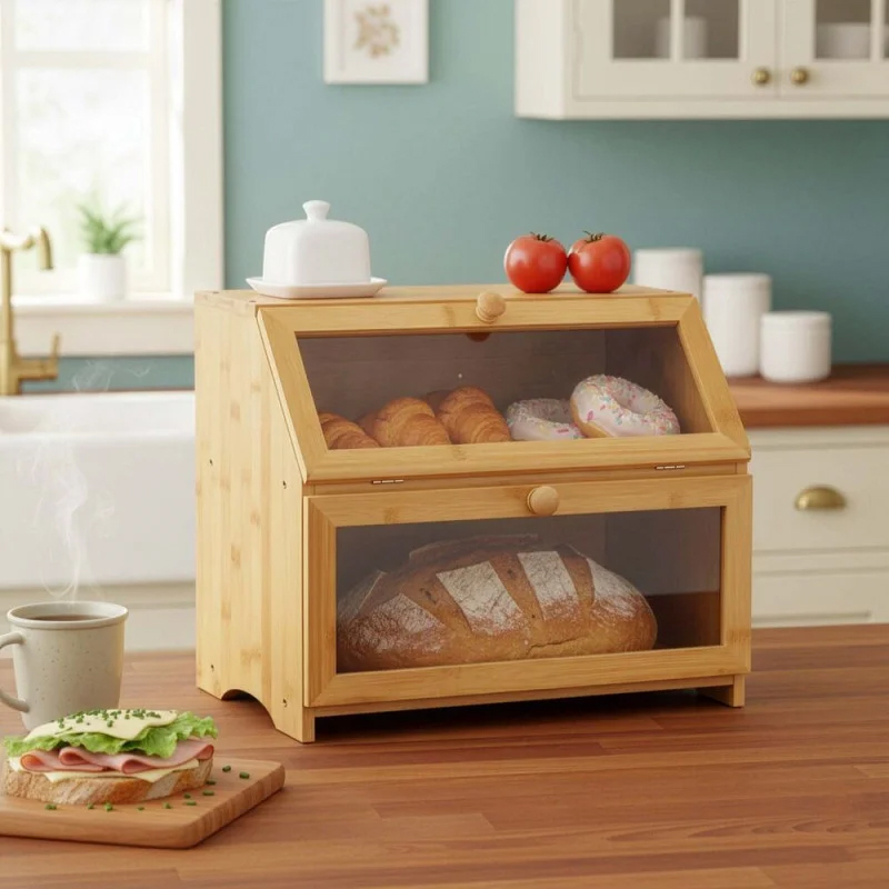 Descriere Cutie paine 2 niveluri bambus, ferestre