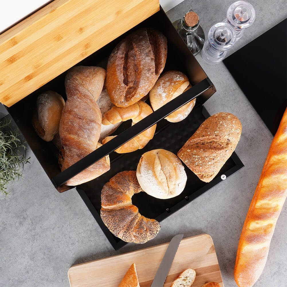 Utilizare: așază cutia pe un blat uscat și depozitează pâine, chifle, baghete sau alte produse de patiserie. Folosește capacul superior ca suprafață practică pentru feliere, apoi închide pentru a păstra conținutul protejat.