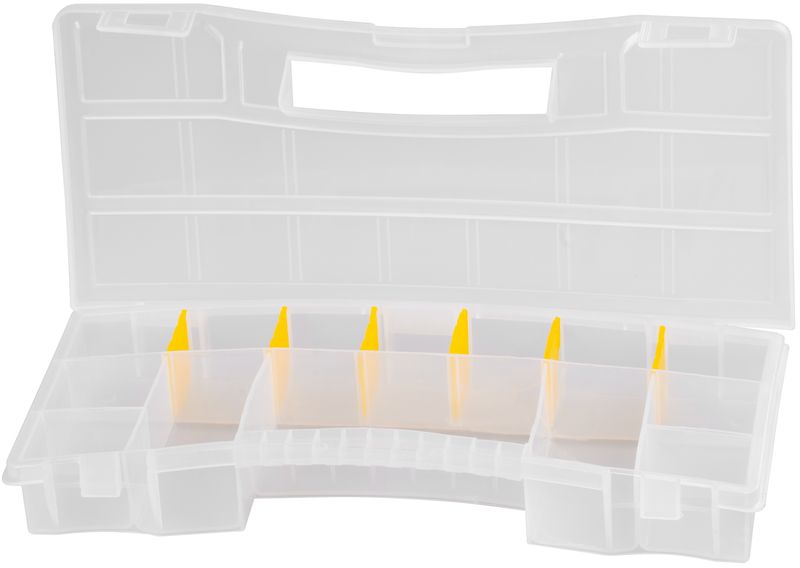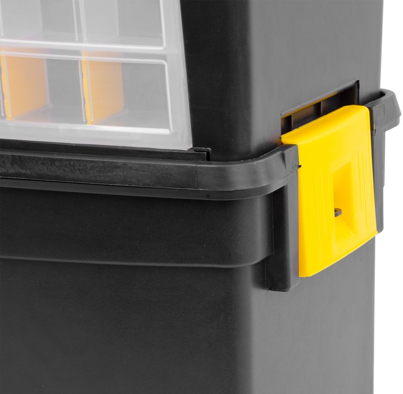 Capacele transparente oferă vizibilitate rapidă asupra conținutului, iar construcția tip valiză multifuncțională este potrivită pentru scule uzuale precum șurubelnițe, clești sau ciocane.