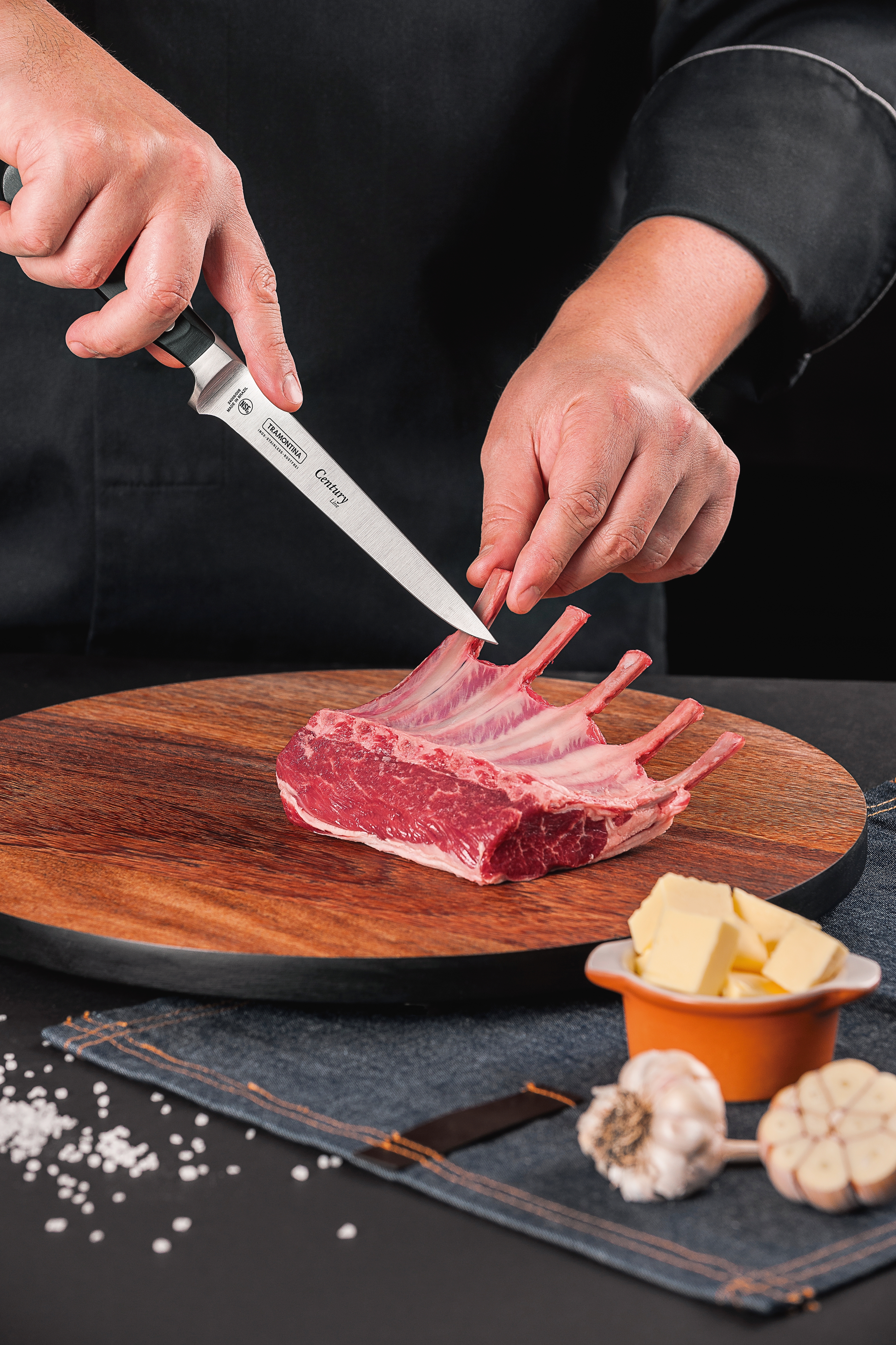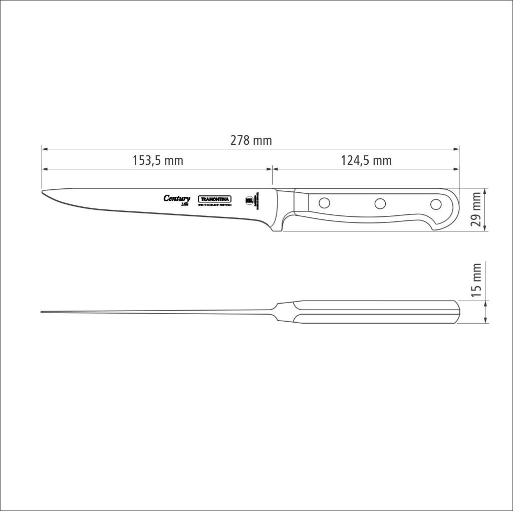Cutit bucatar gama CENTURY, lama forjata din inox de foarte buna calitate (DIN 1.4110) supus unui tratament termic special constand in calire, tratare sub 0ºC (congelare) si intarire, in vederea obtinerii unei duritati de peste 56 HRC, lungime lama 152 mm; maner ergonomic din policarbonat ranforsat cu fibra de sticla, fixat prin nituire, asigura confort si siguranta in momentul taierii; produs cu certificare NSF U.S.A.; se poate curata in masina de spalat vase; lungime totala 275 mm.