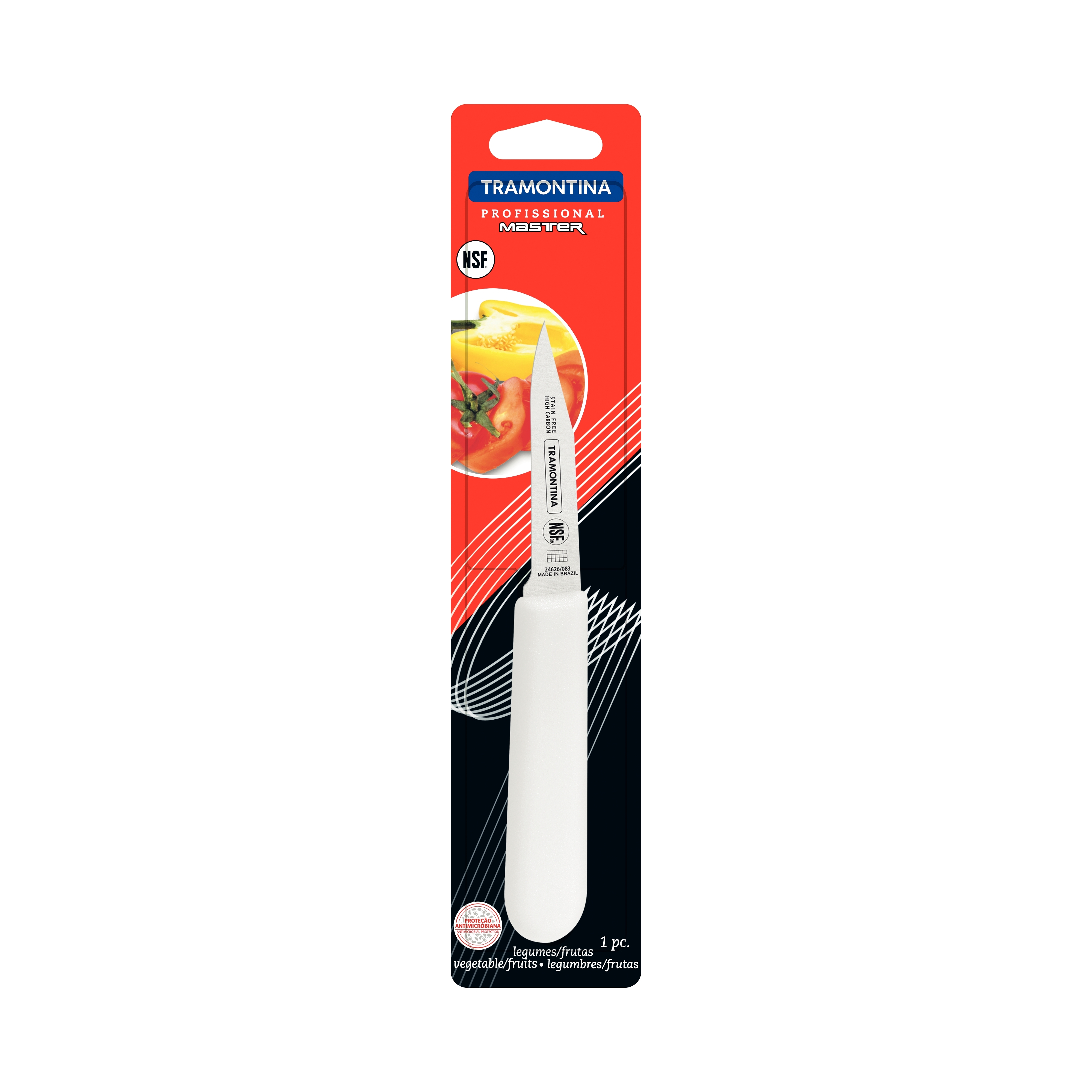 Cutit pentru legume, gama PROFISSIONAL MASTER, lama din inox de foarte buna calitate (DIN 1.4110) supus unui tratament termic special constand in calire, tratare sub 0ºC (congelare) si intarire, in vederea obtinerii unei duritati de peste 56 HRC, lungime lama 76 mm, maner culoare alba din polipropilena cu protectie antimicrobiana Microban®, produs cu certificare NSF U.S.A., lungime totala 180mm