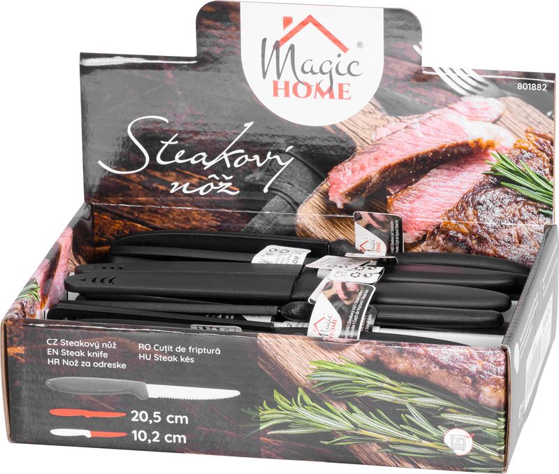 Cuțitul pentru steak MagicHome este alegerea practică pentru orice bucătărie, masă festivă sau grătar în aer liber. Prevăzut cu lamă zimțată din oțel inoxidabil, acesta taie ușor friptura și steak-ul, fără să rupă sau să destrame carnea. În plus, include o teacă de protecție, utilă pentru depozitare și transport în siguranță.