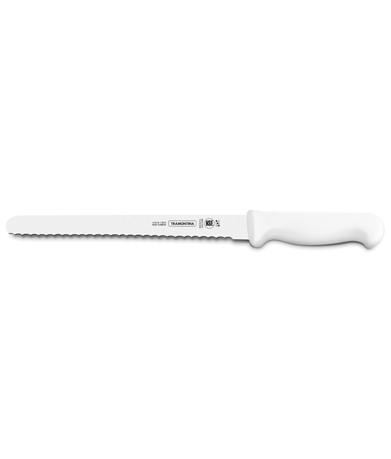 Cutit pentru sunca/paine, gama PROFISSIONAL MASTER, lama din inox de foarte buna calitate (DIN 1.4110) supus unui tratament termic special constand in calire, tratare sub 0ºC (congelare) si intarire, in vederea obtinerii unei duritati de peste 56 HRC, lungime lama 203 mm, maner culoare alba din polipropilena cu protectie antimicrobiana Microban®, produs cu certificare NSF U.S.A., lungime totala 345mm