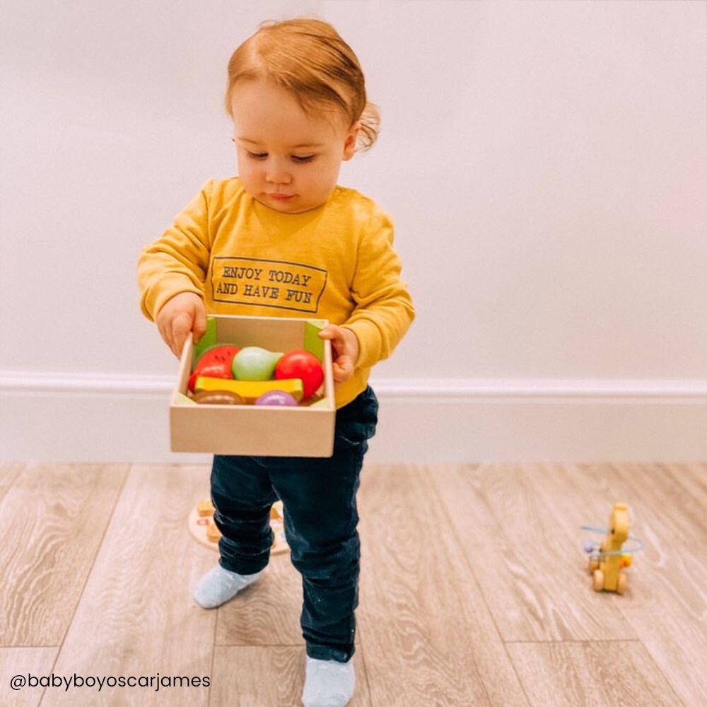 Fructele pot fi „taiate” si reunite usor, oferind o experienta interactiva care incurajeaza indemanarea, creativitatea si recunoasterea formelor si culorilor. Cutia din lemn este practica pentru depozitare si pastreaza toate piesele organizate dupa joaca.