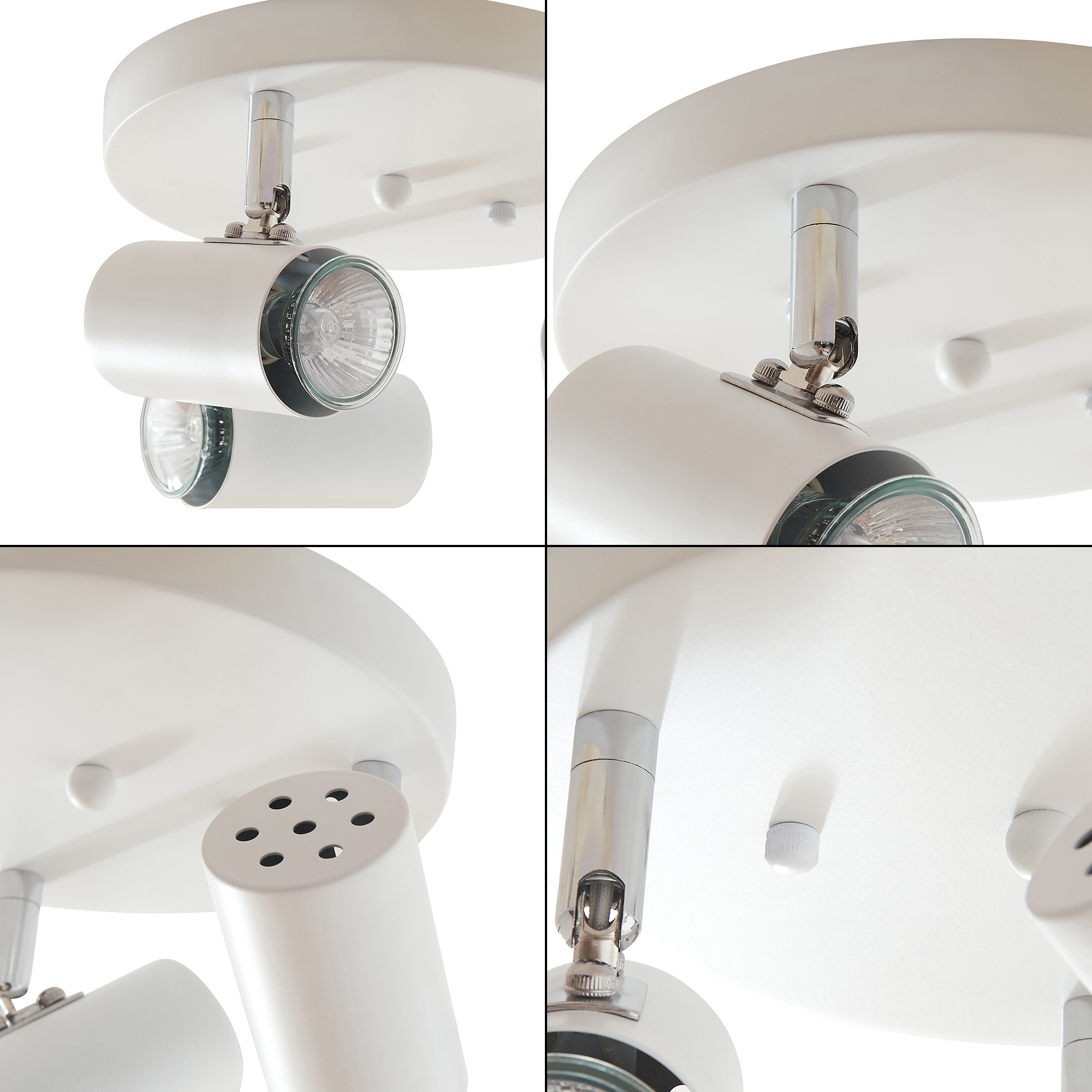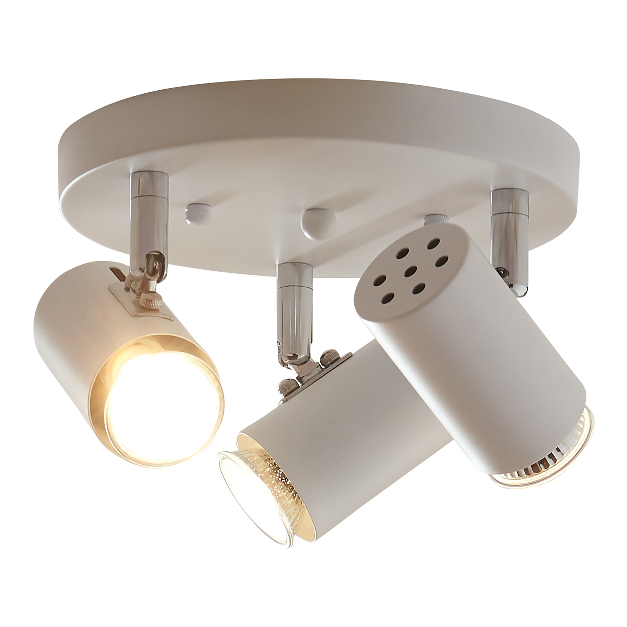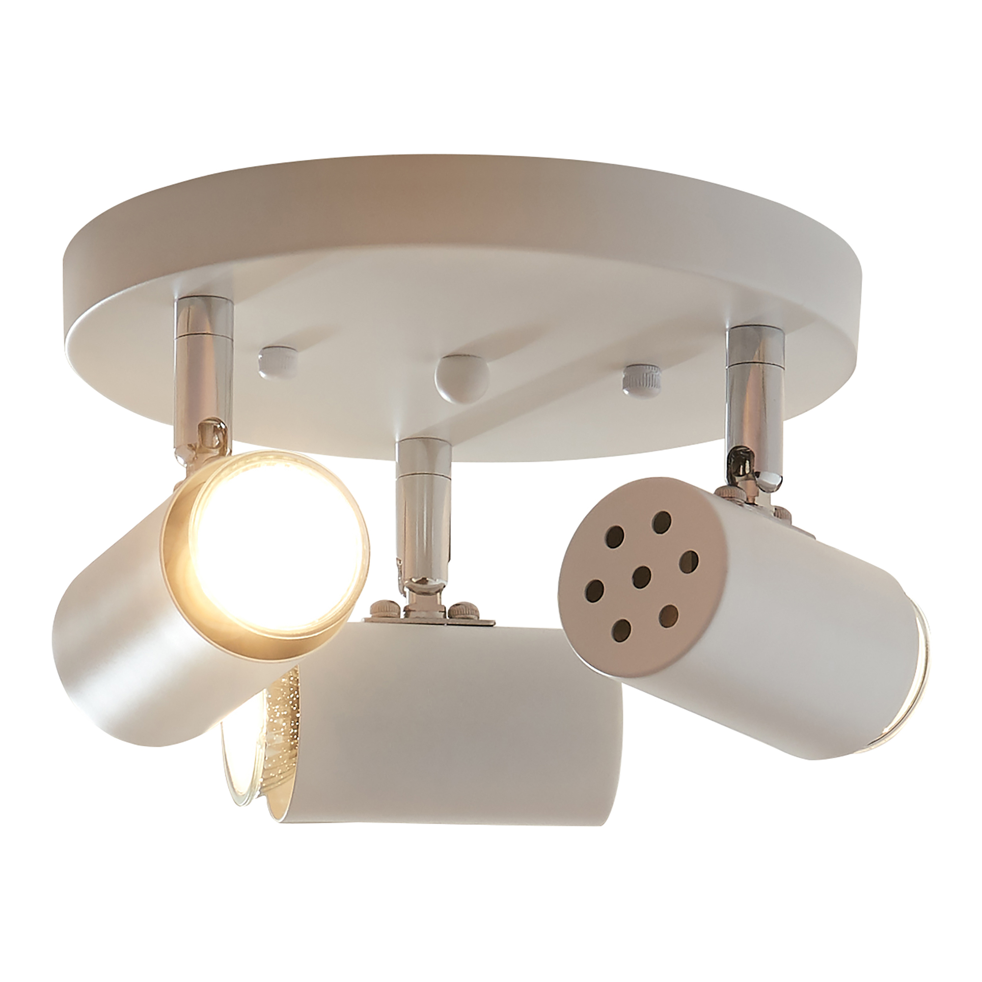 Die Deckenleuchte verfügt über drei individuell ausrichtbare Halterungen, die sich nahtlos in das Design einfügen. Jede Lampenfassung hält ihr jeweiliges Leuchtmittel sicher an seinem Platz und garantiert eine zuverlässige Funktion.
