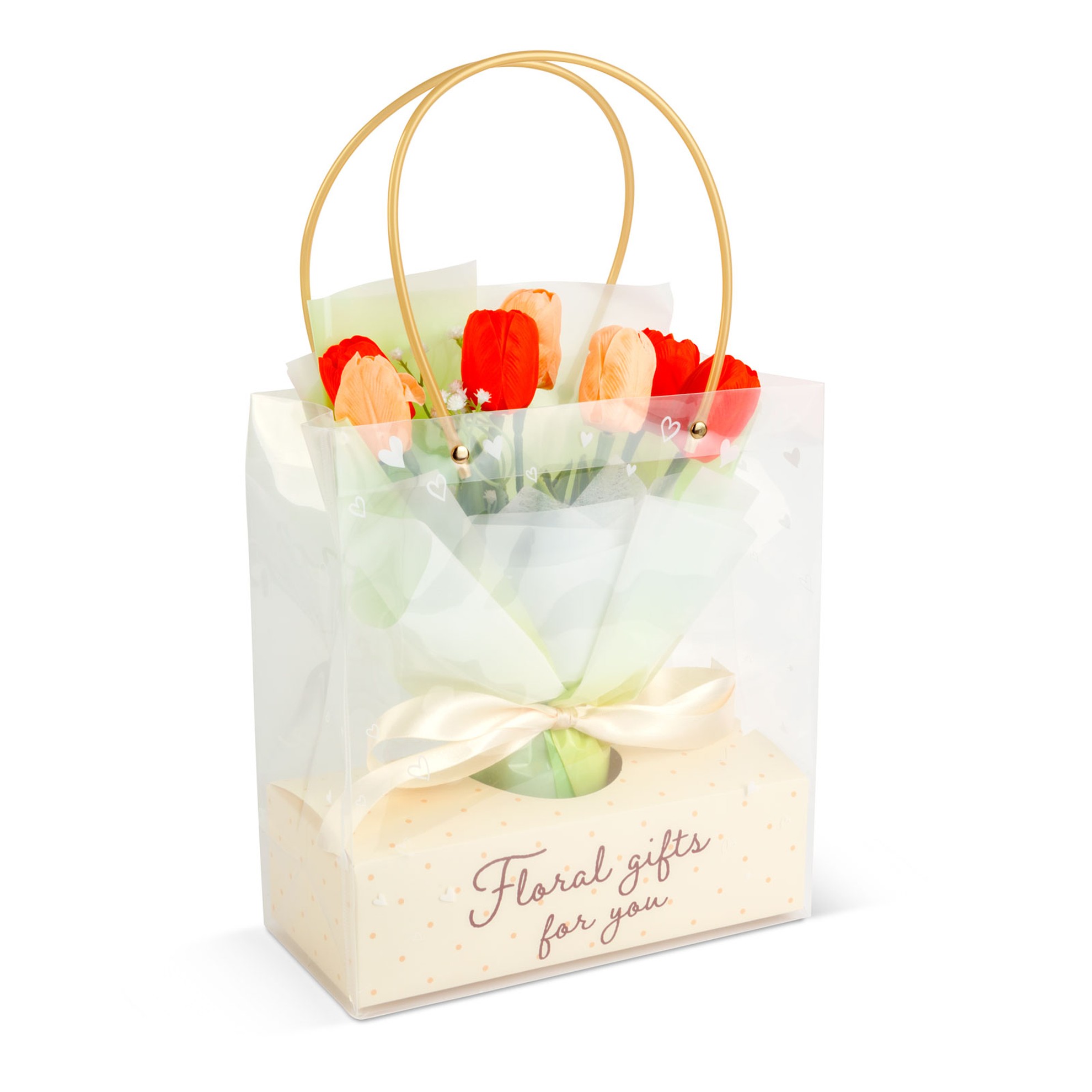Aranjamentul este plasat într-o pungă transparentă, decorată cu inimioare, care este completată cu o fundiță roz, atent legată. La bază se află inscripția „Floral gift for you”, ceea ce subliniază faptul că acest decor este și un cadou ideal.
