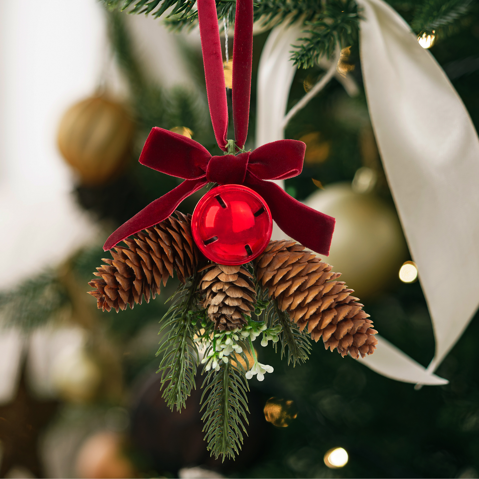 Baza ornamentului este o creangă artificială de pin decorată cu conuri, clopoțel roșu strălucitor și panglică. Cu culoarea verde naturală și ramurile bogate, ramura de pin artificial oferă ornamentului un aspect realist.