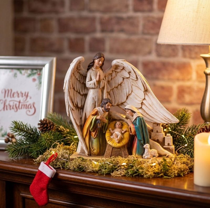 Aduceți în casa dumneavoastră farmecul sărbătorilor cu această decorațiune de Crăciun ce ilustrează Sfânta Familie ocrotită sub aripile unui înger. Realizată cu atenție la detalii din polyresin, piesa oferă un aspect elegant și cald, fiind ideală pentru decorarea mesei, comodei sau colțului festiv din locuință.