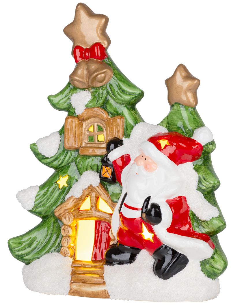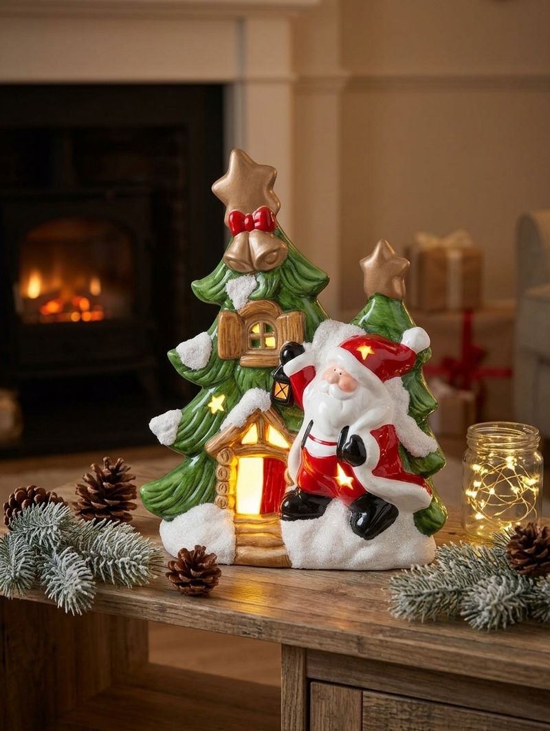Adu magia sărbătorilor în casa ta cu această decorațiune de Crăciun cu LED înfățișând un brad festiv alături de Moș Crăciun. Realizată din teracotă și finisată cu detalii vesele, piesa oferă o lumină alb cald plăcută, ideală pentru a crea o atmosferă primitoare în living, hol sau dormitor.