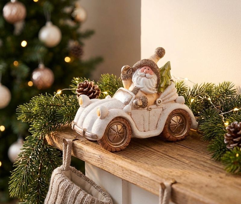 Decoratiune de Craciun din ceramica cu Mos Craciun in masina retro