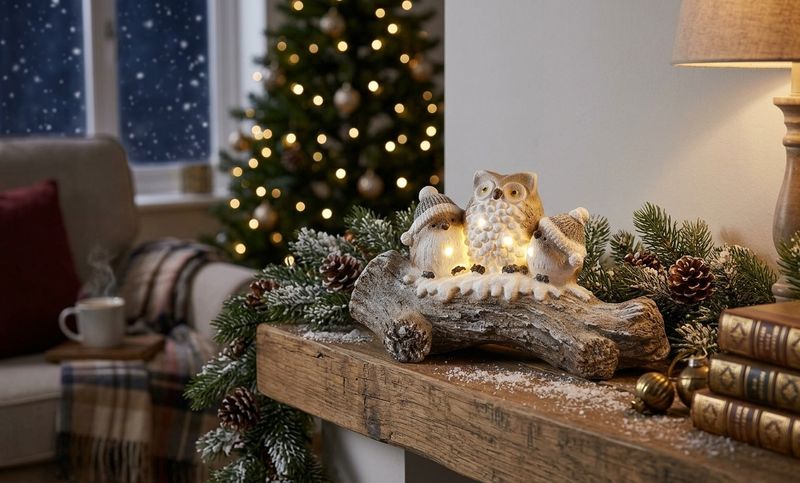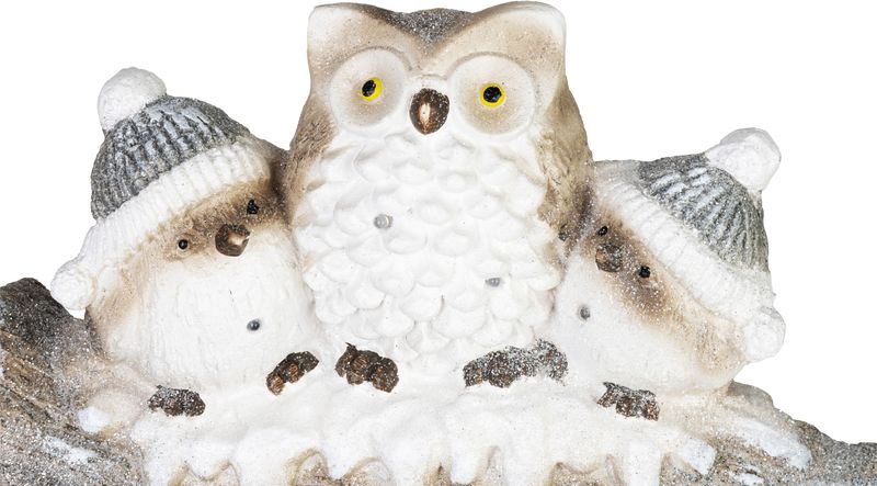 Modelul redă un grup de bufnițe simpatice, cu detalii atent lucrate și finisaj cu aspect de zăpadă, oferind un efect vizual de poveste. Iluminarea LED cu lumină albă caldă evidențiază decorul și contribuie la o atmosferă relaxantă, fără a fi nevoie de amplasare lângă priză, datorită alimentării pe baterii.