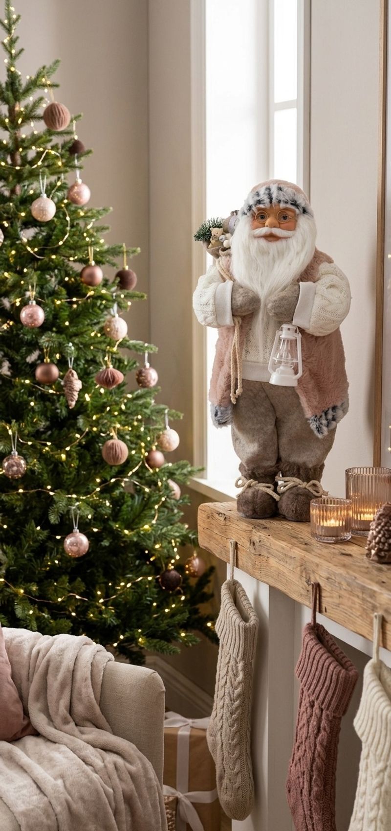 Decorațiunea de Crăciun Moș Crăciun cu cadou este alegerea ideală pentru a aduce un plus de farmec și căldură în decorul festiv al casei tale. Realizată în nuanțe delicate de roz-maro, această figurină decorativă de Crăciun impresionează prin detaliile atent lucrate, barba bogată, haina elegantă cu aspect pufos și accesoriile specifice sărbătorilor.